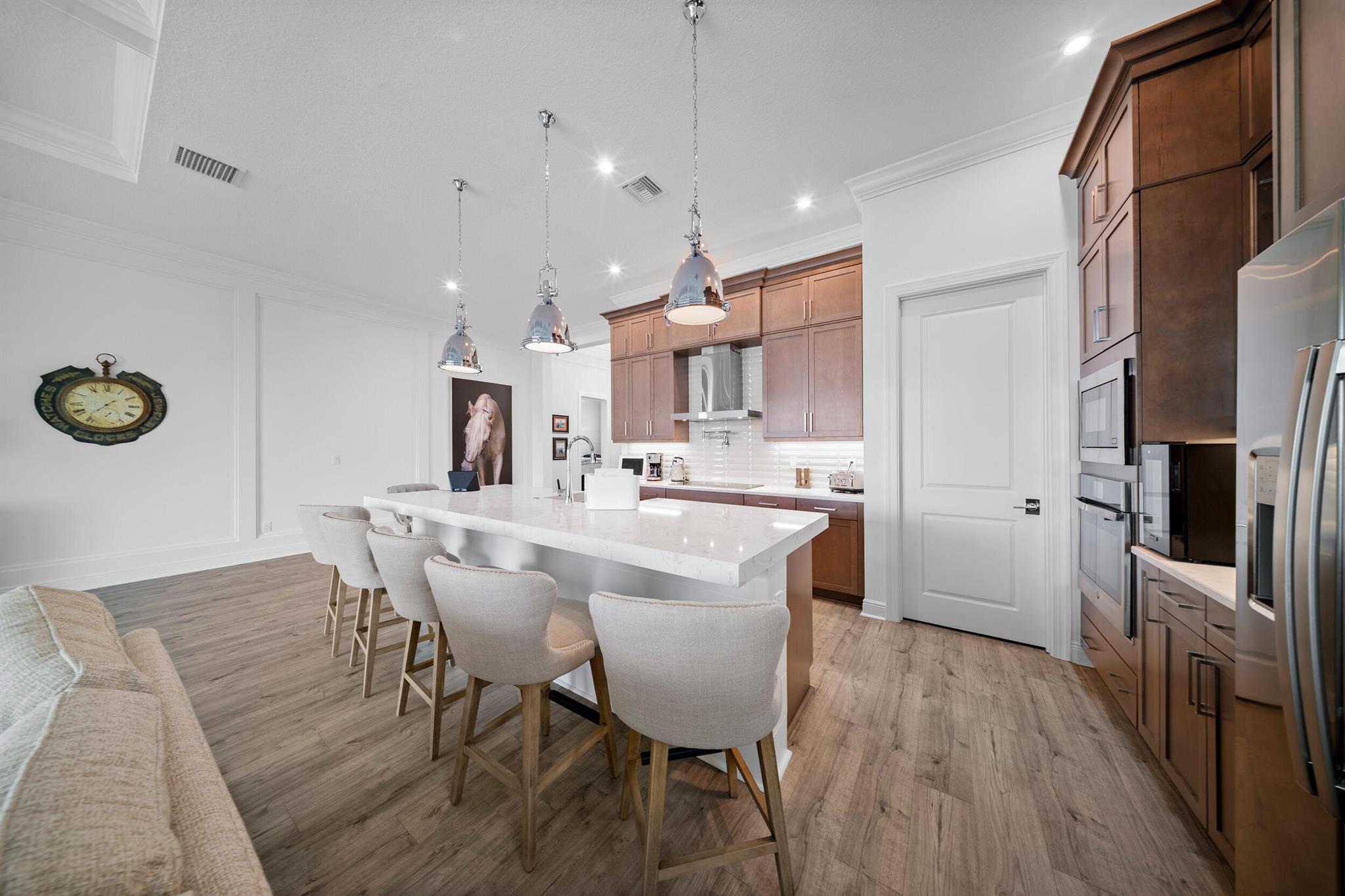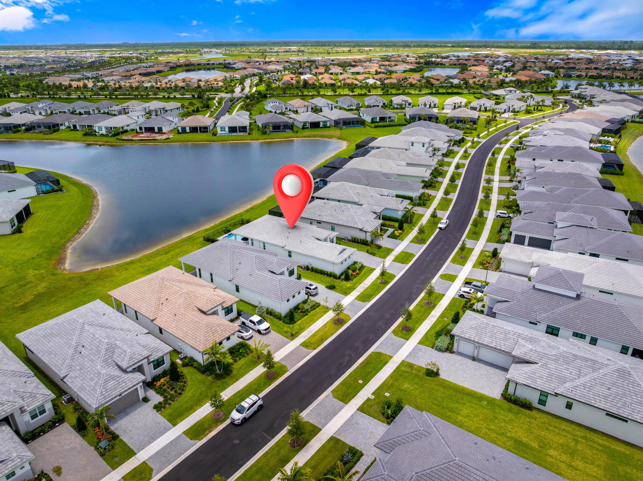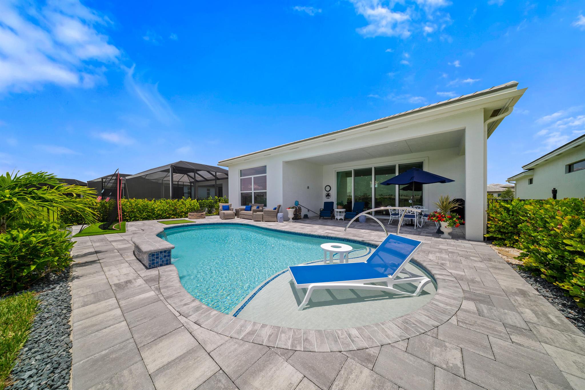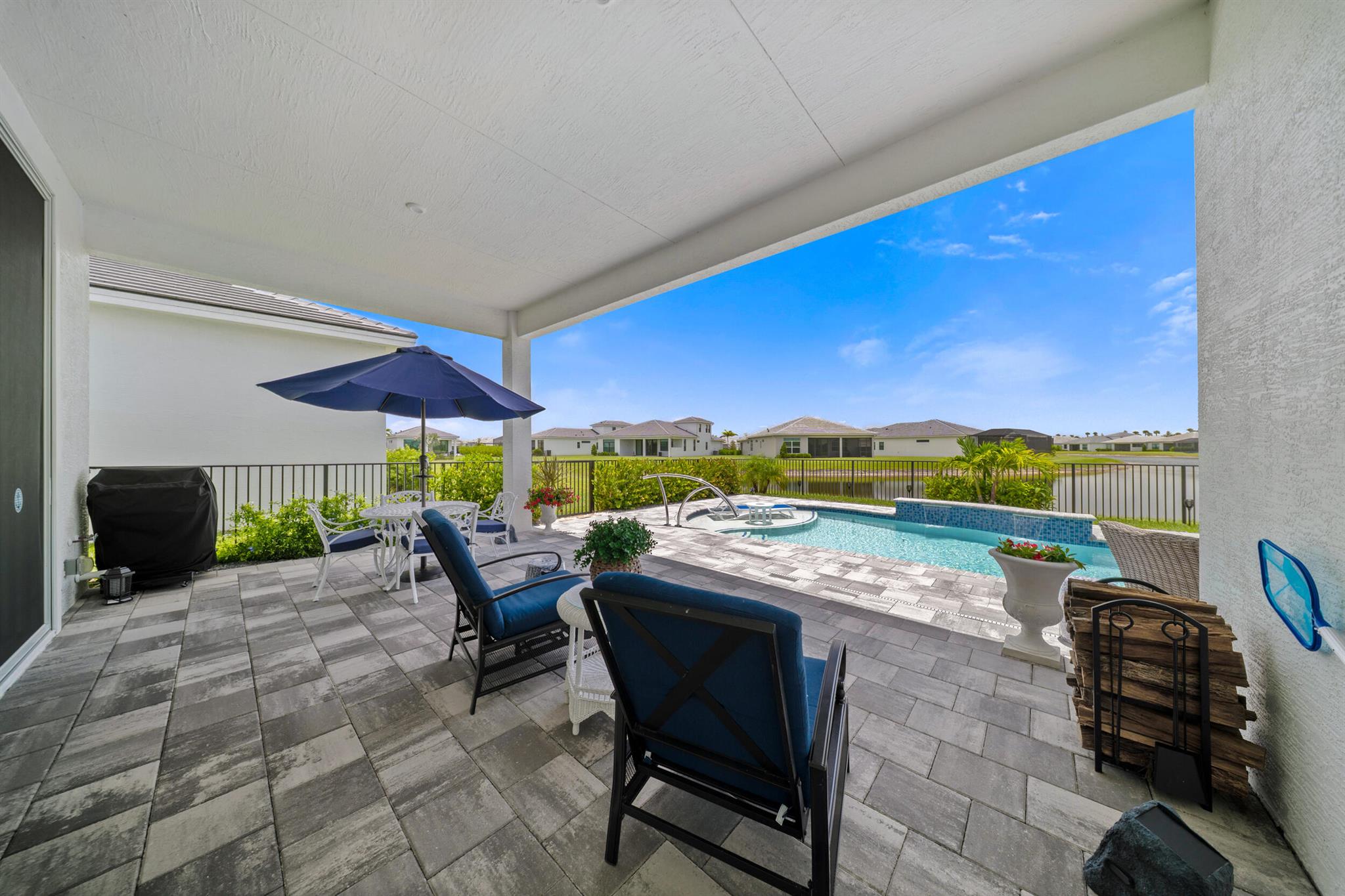 Designed for comfort and relaxation, this young home keeps stress at bay. With over $100K in upgrades, lakeview sunsets, sunshelf pool w/waterfalls and dual master suites, calm is the mood of every day. A neutral color pallette topped off with soaring coffered ceilings, and complemented by 10'sliders leading to the pool. The kitchen is the gathering place with a 10ft, 3''thick quartz island, luxe cabinetry, and a gourmet appliance package. A grand owners suite/spa like bath with TV and expanded walk in closet. A second private suite and guest room give everyone space to enjoy. Golf cart access to PGA Golf Club(memberships avail).Club Talavera, 27 pickleball courts, indoor lap pool and more will keep you fit and social. Located near restaurants, shops. 45 min to West Palm, 2hr to Orlando.