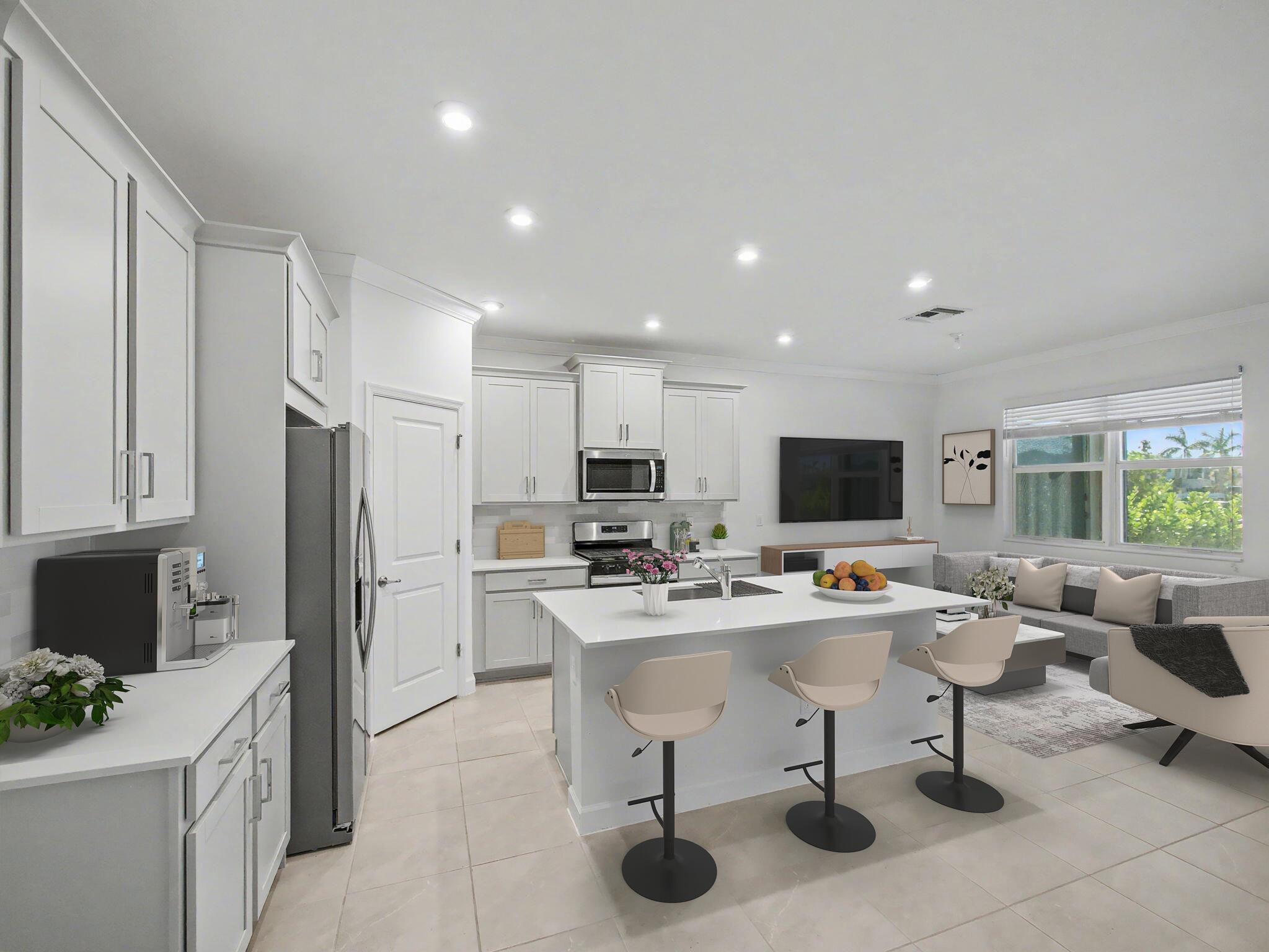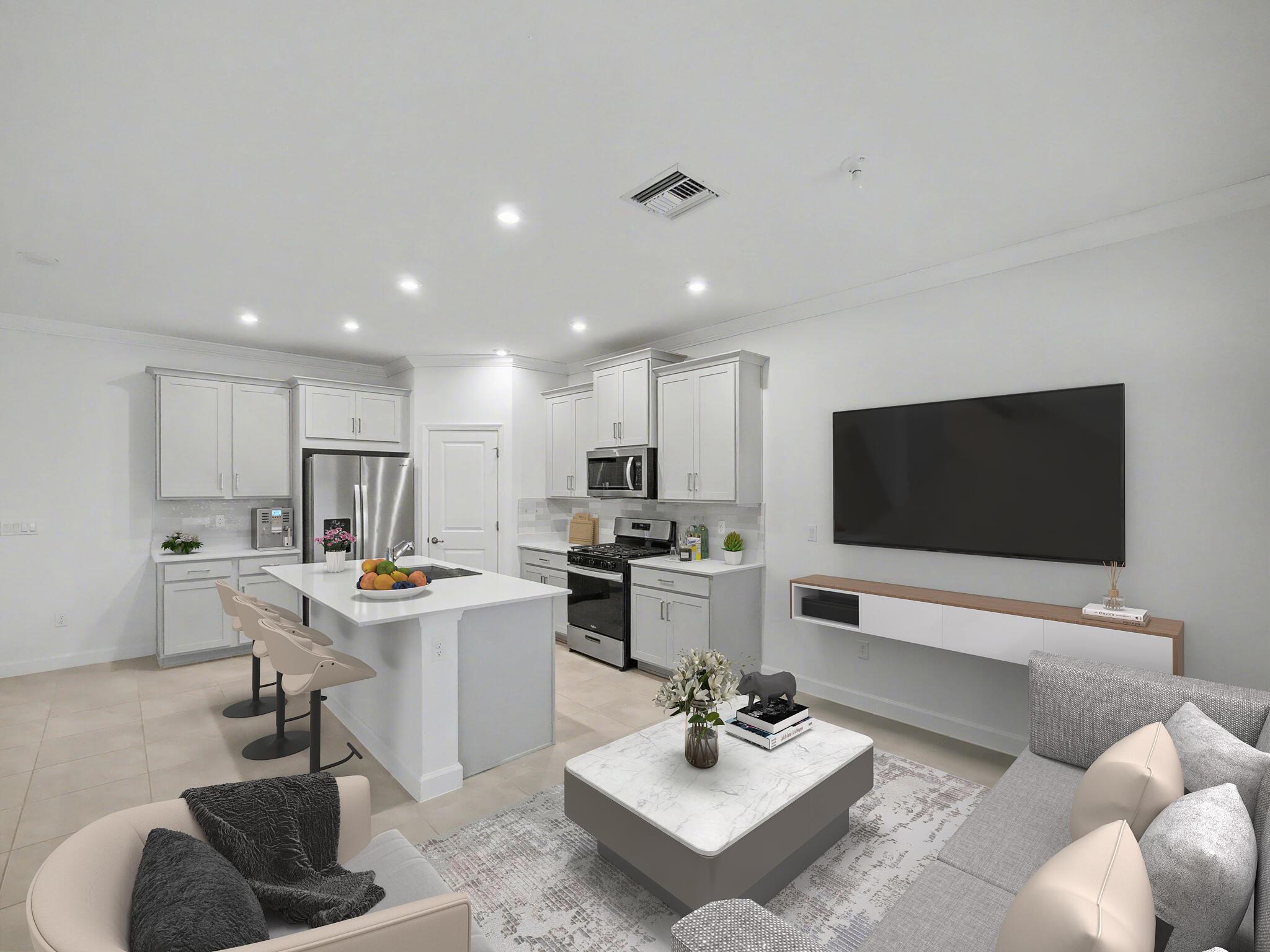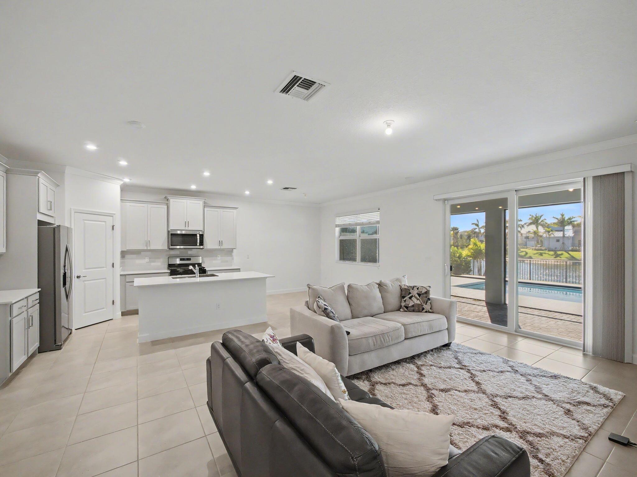 Welcome to this beautifully upgraded 4-bedroom, 2-bath, 2-car garage home with a private pool, located in the highly sought-after Cadence at Tradition. This move-in-ready residence features impact glass throughout, tinted windows and doors, LED lighting, crown molding in living areas, and tile flooring throughout the entire home for a clean, modern feel. The gourmet kitchen is a standout with quartz countertops, a farmhouse sink, gas stove, soft-close drawers and cabinets, pull-out garbage, a walk-in pantry, and a new garbage disposal--perfect for both everyday living and entertaining. The home also includes gas dryer and water heater for added efficiency. Retreat outdoors to your oversized screened patio complete with a privacy sun shade, outdoor kitchen, and a 12x24 chlorine pool.