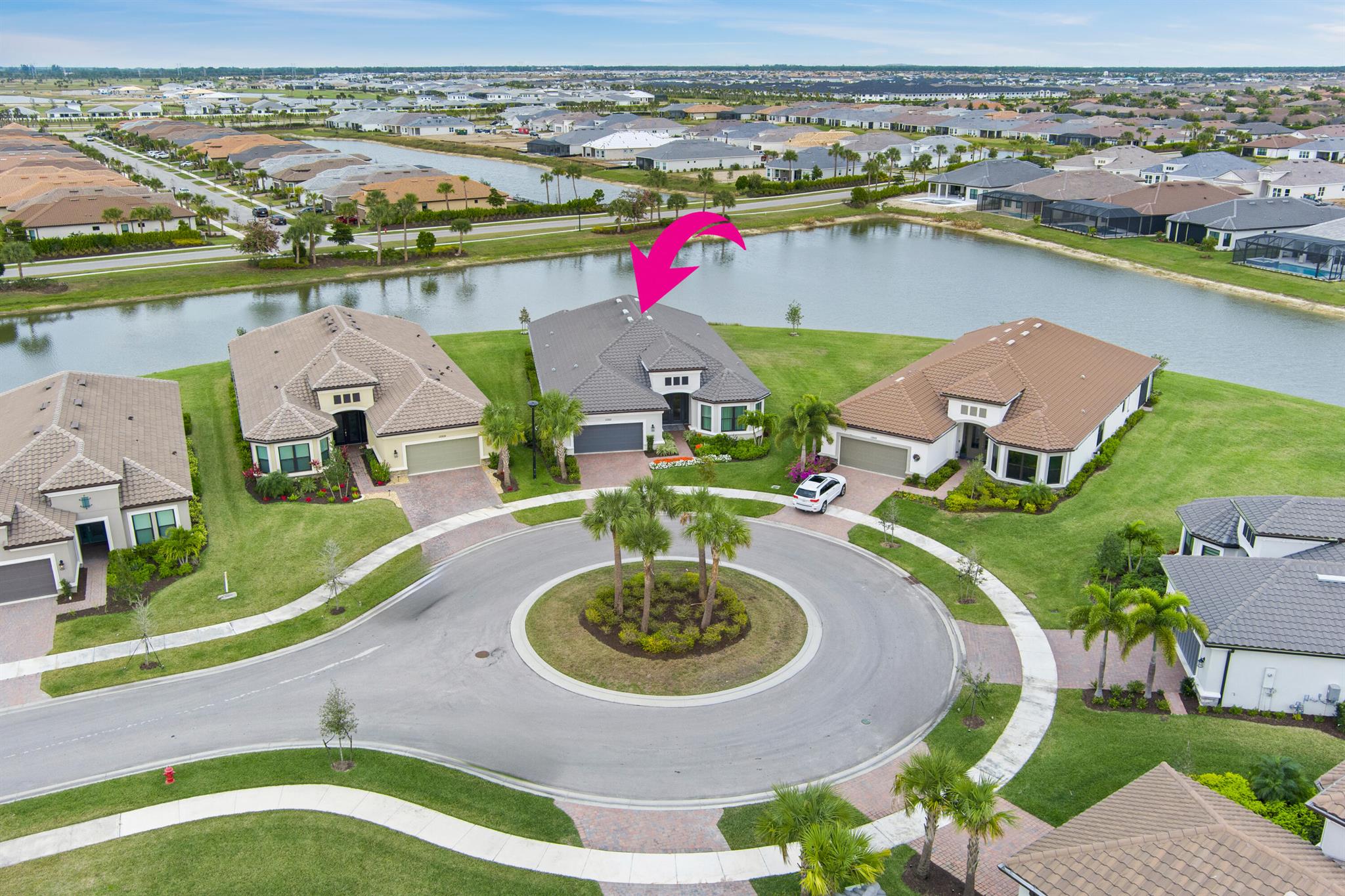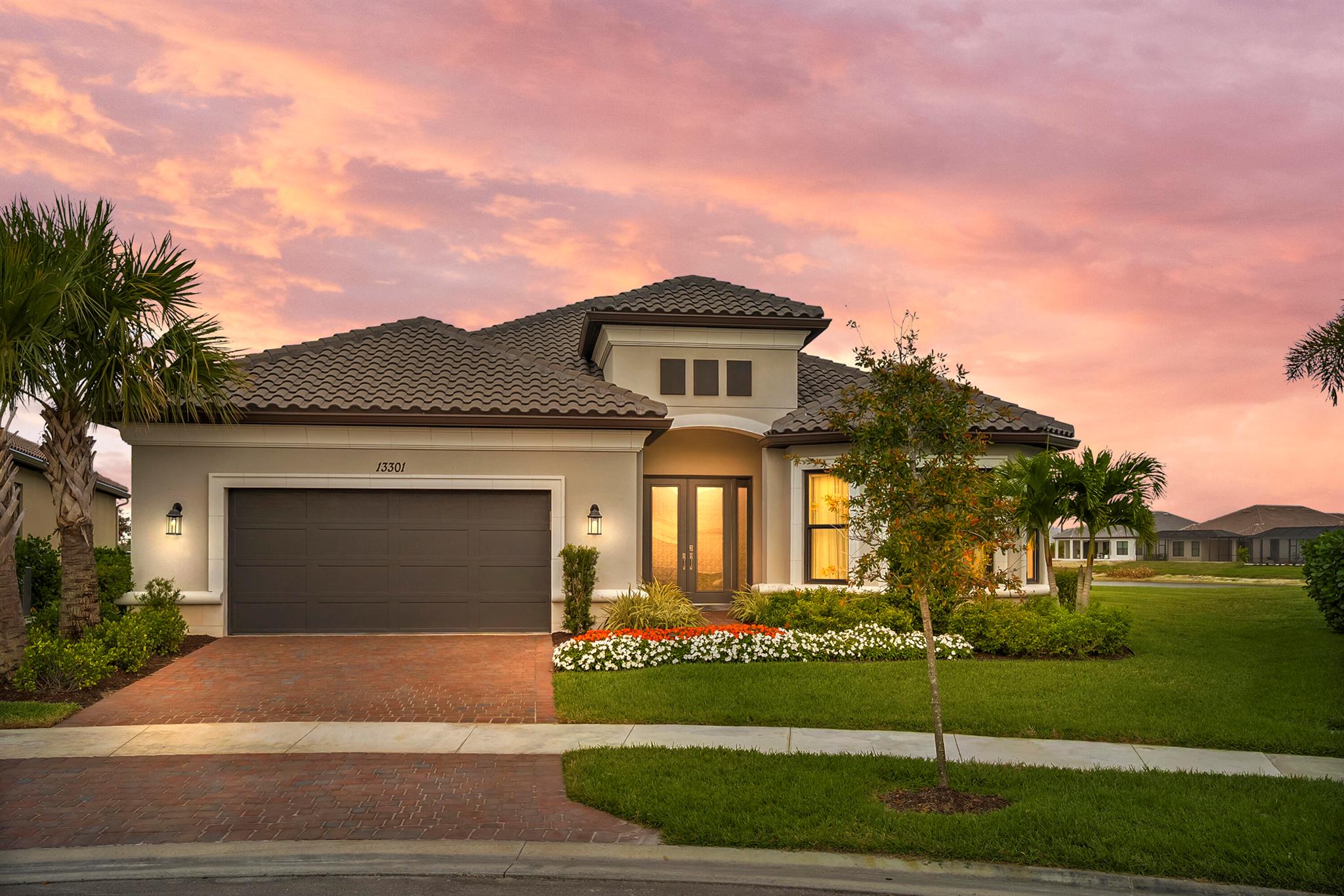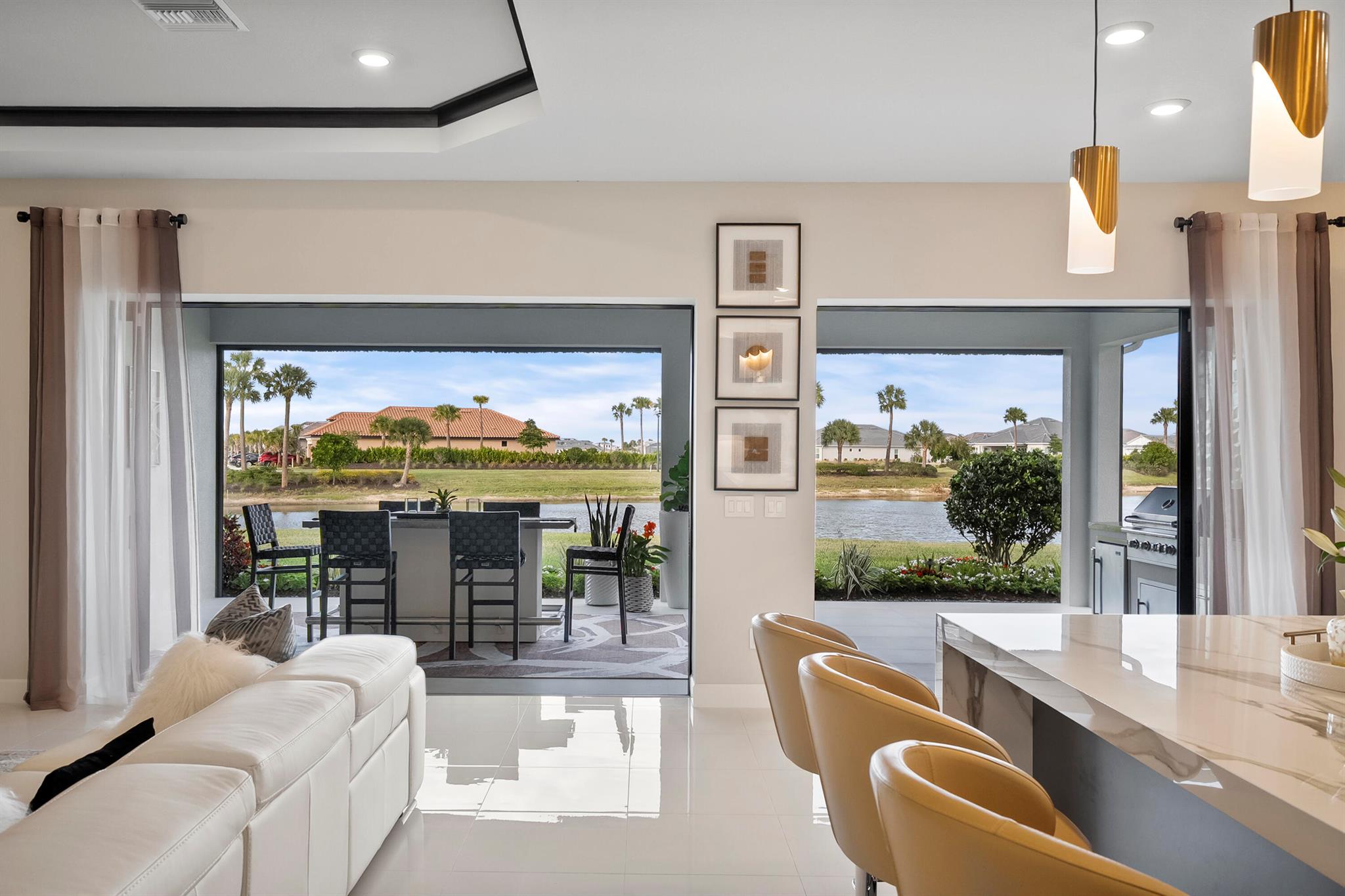 This Pallazio floor plan features extensive post-construction upgrades that go far beyond builder offerings. Offering 3 bedrooms, 3 bathrooms, plus a study/flex space, this exceptional home is situated on a quiet cul-de-sac on an oversized .36-acre pie-shaped lot that widens at the rear and overlooks a serene lake. Structural enhancements include an extended covered lanai, extended gourmet kitchen, outdoor kitchen gas and plumbing rough-ins, and extended bay windows in the primary suite. All impact windows and doors, paired with a brand-new barrel tile roof (2023), provide peace of mind and contribute to lower homeowners insurance rates. Inside, oversized porcelain tile flooring throughout (no carpet) creates a light, airy, and cohesive aesthetic. Professionally designed interiors take