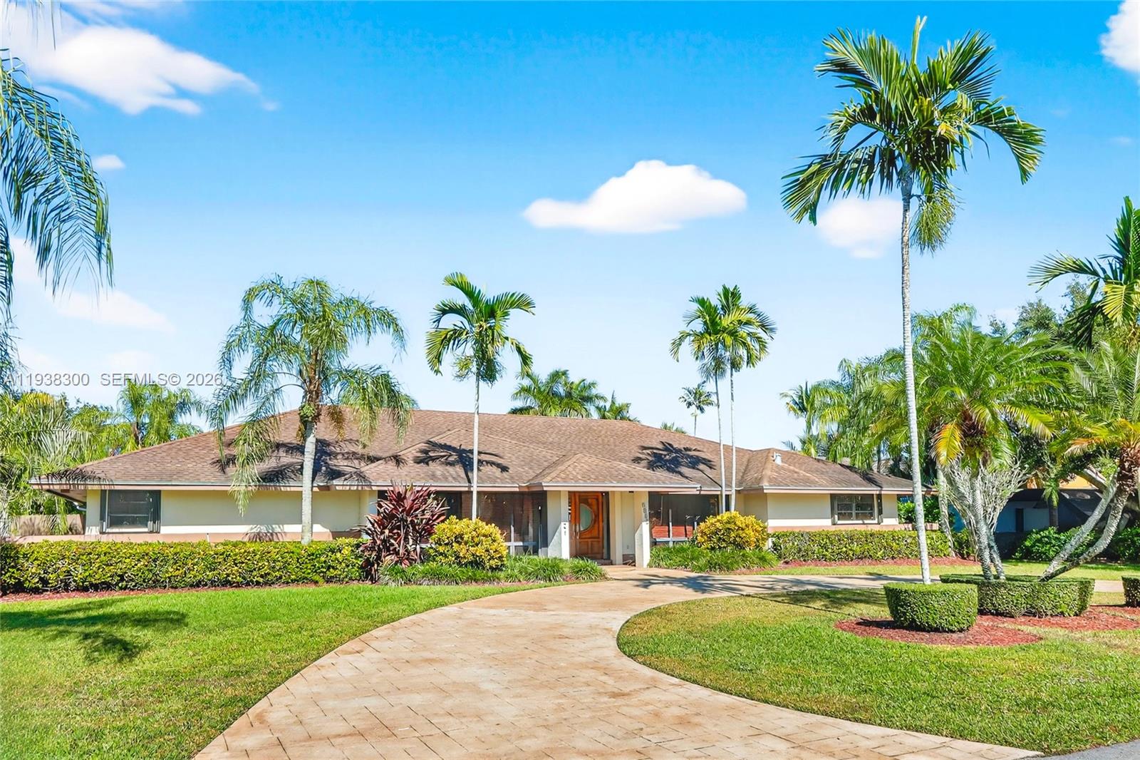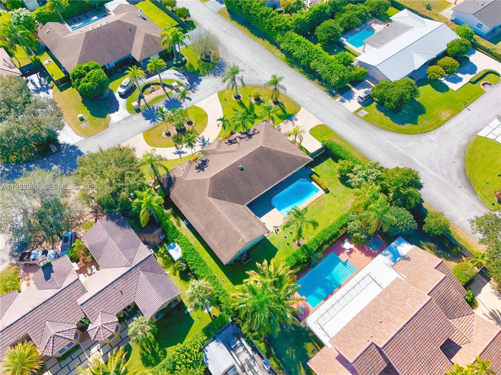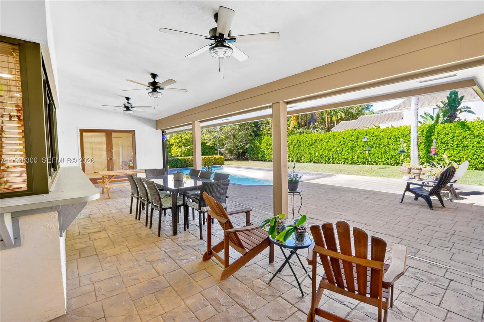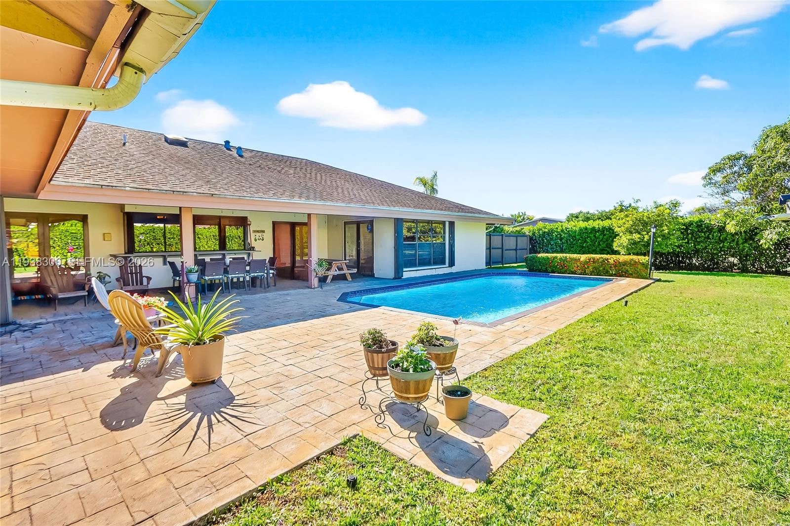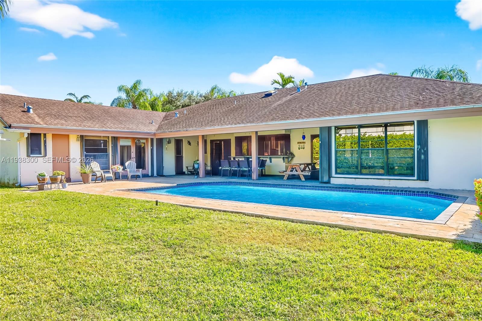 Located in a prime location of The Falls area, this immaculate five bedroom, four bath home is certain to appeal to young, growing, and established families. Highlighted by a gorgeous soaring wood ceiling, this lovely home boasts a spacious open-plan living area bathed in natural light. Open kitchen with breakfast nook features a panoramic view of the pool. Entertaining is easy with wet bar enhancing the indoor-outdoor flexibility. French doors add to the flowing layout. Fabulous covered outdoor space is perfect for gatherings. Dedicated laundry room, two-car garage, and accordion shutters all add to the home's comfortable amenities.