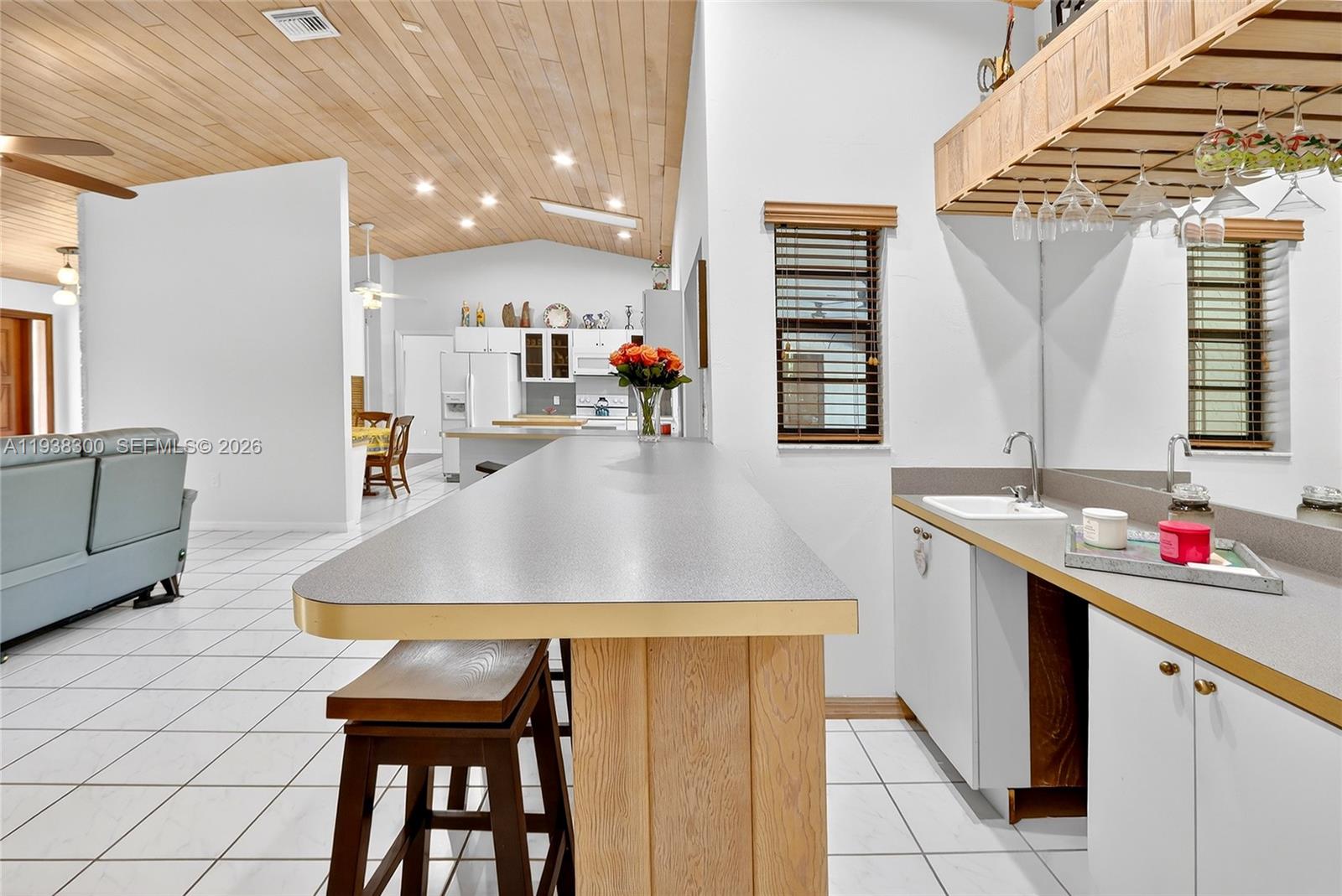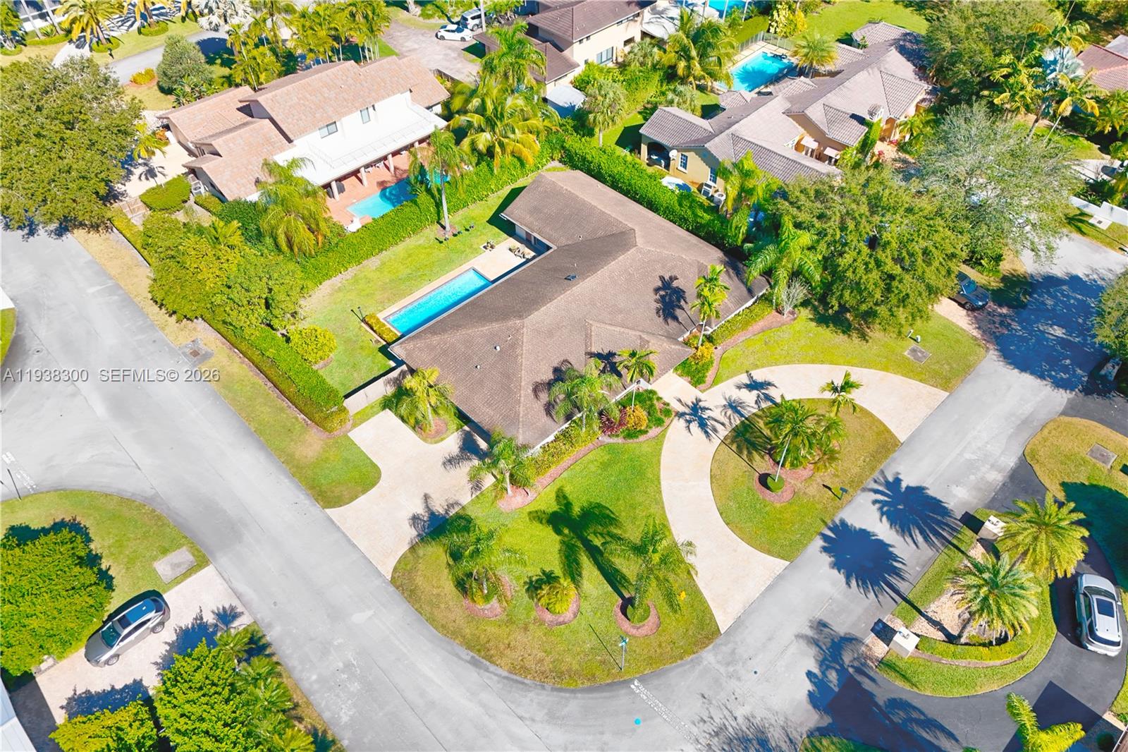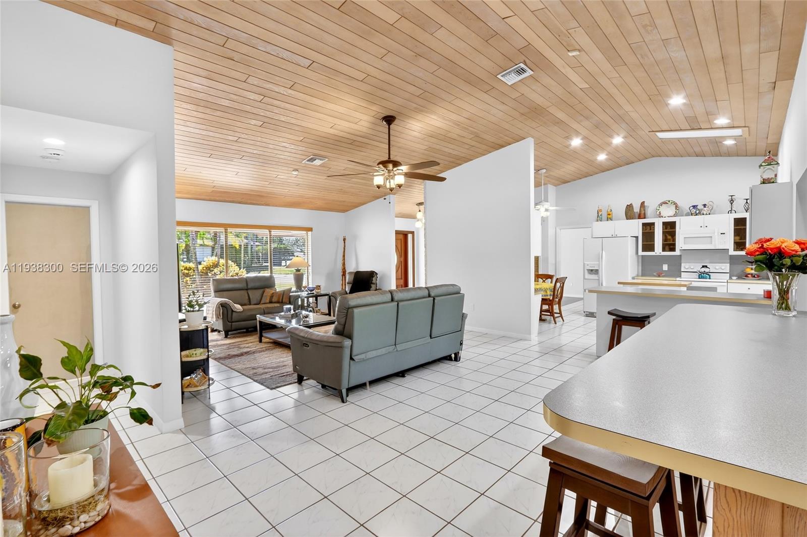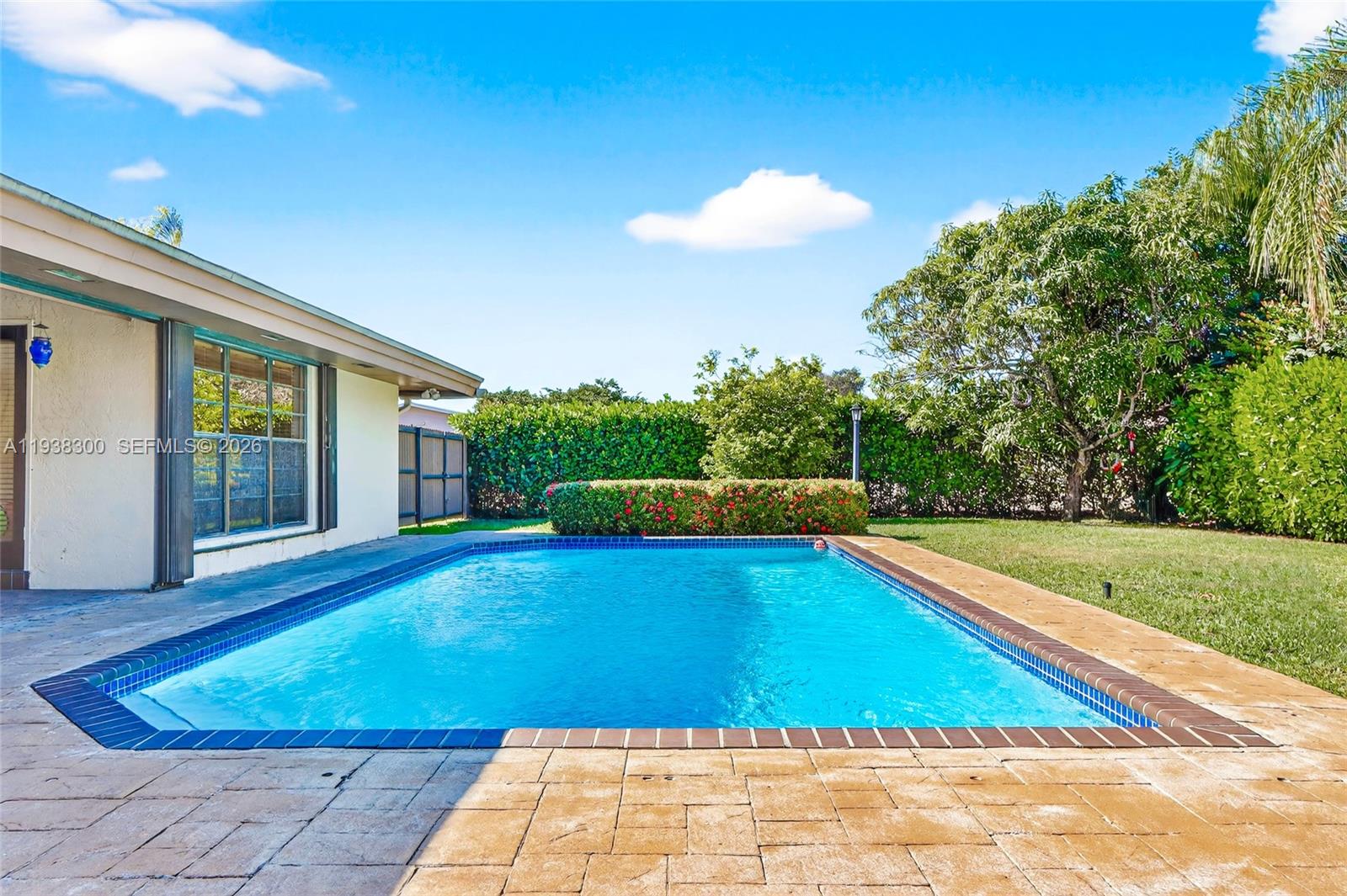 Located in a prime location of The Falls area, this immaculate five bedroom, four bath home is certain to appeal to young, growing, and established families. Highlighted by a gorgeous soaring wood ceiling, this lovely home boasts a spacious open-plan living area bathed in natural light. Open kitchen with breakfast nook features a panoramic view of the pool. Entertaining is easy with wet bar enhancing the indoor-outdoor flexibility. French doors add to the flowing layout. Fabulous covered outdoor space is perfect for gatherings. Dedicated laundry room, two-car garage, and accordion shutters all add to the home's comfortable amenities.