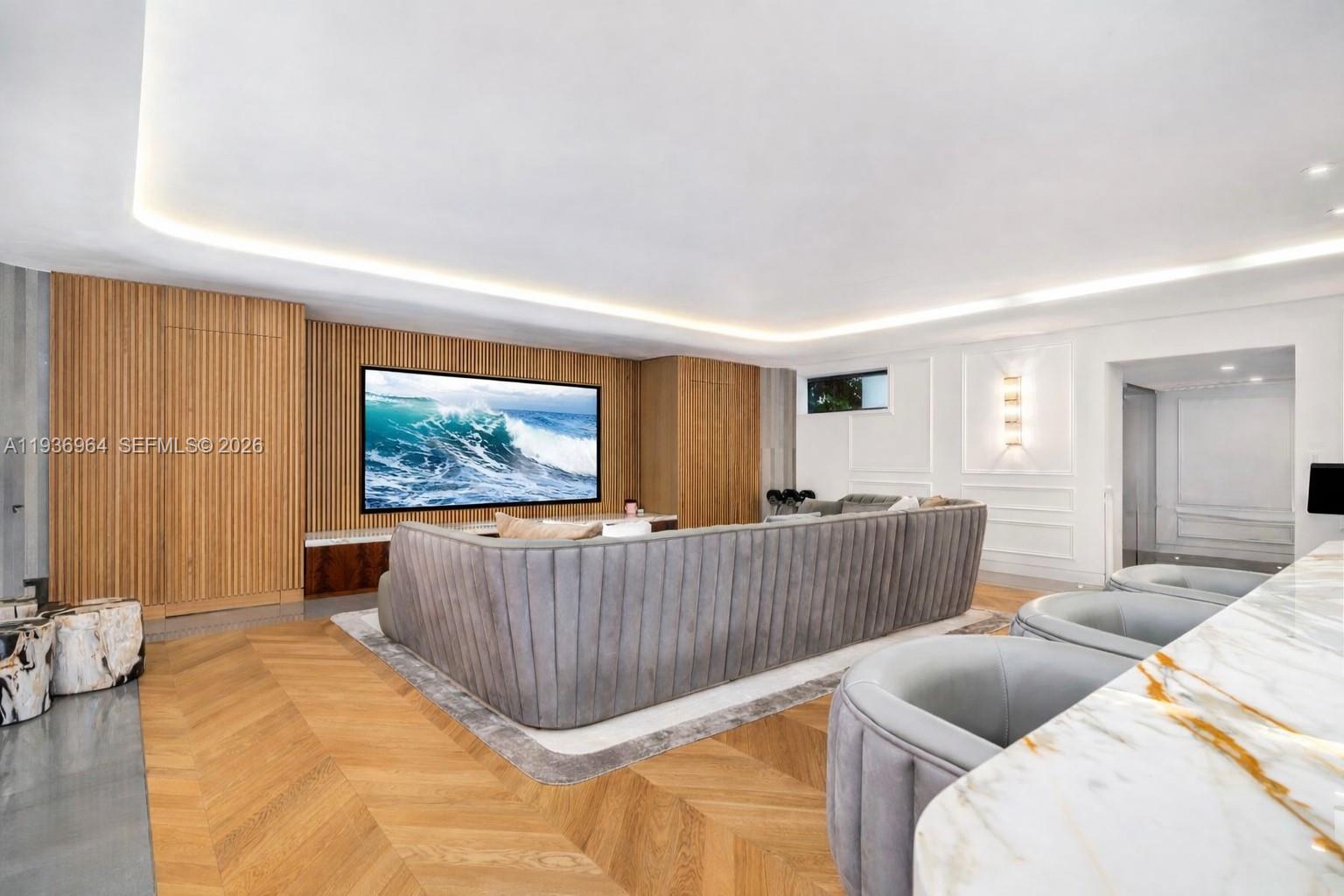 Built in 2018 & designed by DOMO Architecture, this extraordinary waterfront estate stands as the tallest residence on Dilido Island, offering architectural distinction, privacy & uncompromising luxury. Conceived for grand-scale entertaining, the home features executive-level security & soaring 12 foot ceilings with a fully integrated smart-home system. An exceptional use of luxurious marble throughout the interior & exterior creates a timeless, gallery-like elegance. The state-of-the-art kitchen, finished in striking Calacatta Gold marble & equipped with Wolf, Miele, & Sub-Zero appliances, anchors the home as a natural gathering space. Living areas flow seamlessly outdoors, embracing indoor-outdoor living with a resort-style pool, Jacuzzi, cabana, & a custom extra-large rounded Ipe dock, ideal for waterfront entertaining. Private bedroom suites embody modern luxury, featuring warm chevron oak floors, floor-to-ceiling sheer drapery, refined marble details, & Waterworks faucets and shower fixtures throughout. A dedicated cinema room with an 8K 125-inch projection screen & THX surround sound delivers a true private theater experience. Crowning the residence is a spectacular rooftop retreat with 360-degree water views of Downtown Miami and Miami Beach, complete with an award winning fully edible rooftop garden/farm. Additional features include a showroom garage (lift capable) & mature fruit & vegetable trees, completing this one-of-a-kind waterfront offering.