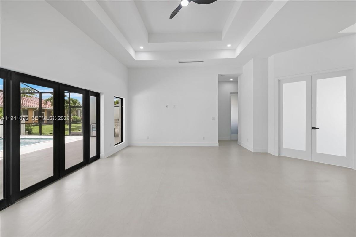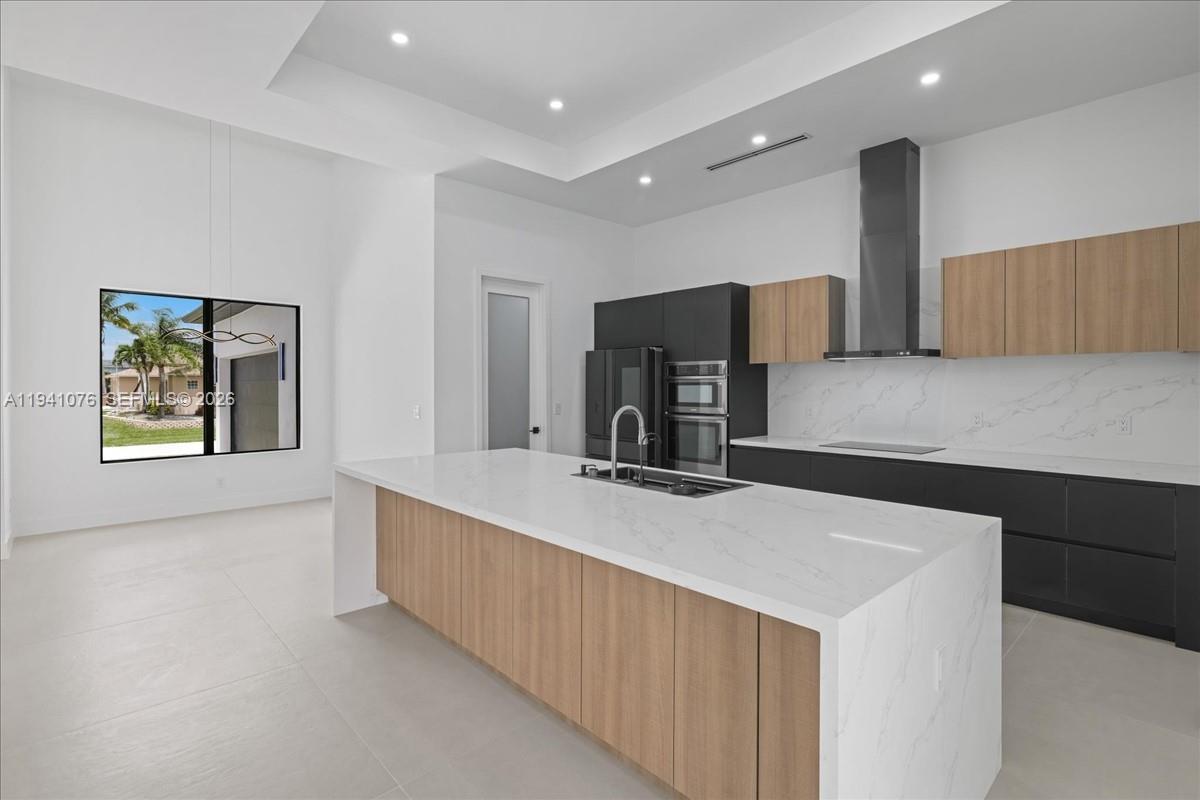 Step into this stunning new construction home — a perfect blend of modern style and everyday comfort in the heart of SW Cape Coral. With 3 bedrooms + den, 3 bathrooms, and 2,049 sq ft, this home delivers thoughtful design, quality finishes, and a true Florida lifestyle. Inside, enjoy 14-ft ceilings, large porcelain tile flooring, custom lighting, and an open layout filled with natural light. The chef’s kitchen features a striking waterfall quartz island, induction cooktop, premium appliances, and a multifunction sink with built-in glass washer. Sleek black matte fixtures, frosted interior doors, and a designer laundry room elevate every detail. Your outdoor oasis includes a heated saltwater pool with sunshelf, natural stone lanai, and a full outdoor kitchen — perfect for entertaining. The spa-inspired primary suite offers a wrap-around shower, soaking tub, and an elegant double vanity. Additional highlights: epoxy-finished garage, EV charger, and paid city assessments. Located minutes from Cape Harbour, waterfront dining, shopping, parks, schools, and boat ramps. This home is truly a must-see. Schedule your private showing today!