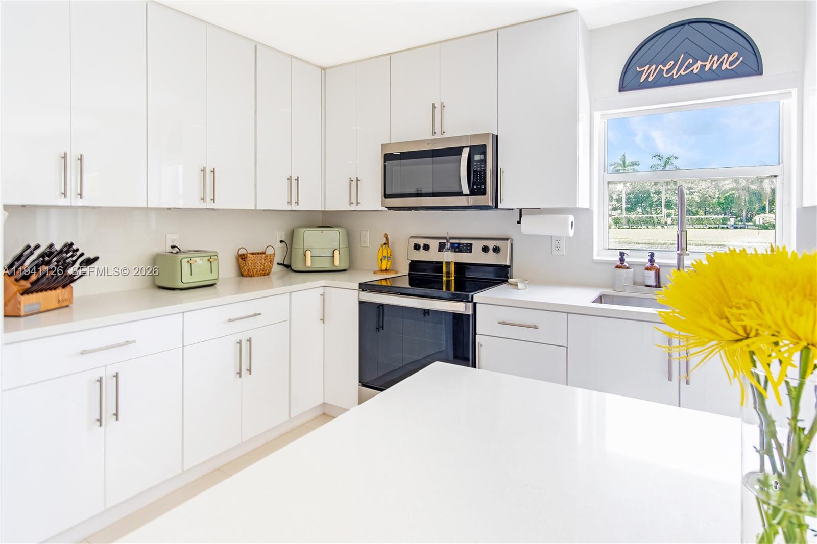 Lakefront luxury! This beautiful home in the Huntington community has been completely renovated. This modern oasis boasts remote control blinds, a beautiful kitchen with a quartz waterfall island, & porcelain tile throughout. Enjoy stunning views & bright spaces with dimmable lights. Features: stainless steel appliances, upgraded washer/dryer, impact door, & 2022 AC. Gated community with lakefront perks! Can be sold furnished.