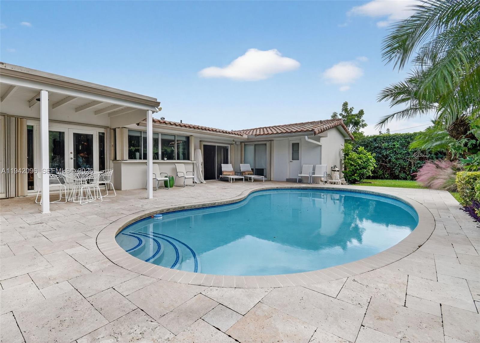 Welcome to this beautifully upgraded single-story residence offering timeless curb appeal located in the highly desired neighborhood of Highland Lakes situated on a quiet cul-de-sac. Property offers convenient access to nearby Aventura Mall shopping, top rated schools, great dining options, houses of worship, and major roadways while maintaining a peaceful residential feel. This inviting home features 3Bedrooms/3Full baths/library-Den (possible 4th bedroom), a super cozy family/media room which includes a home theater sound system. In addition, it offers a classic tile roof (pre-inspected and professionally maintained 2025), circular driveway, enhanced by mature palms and greenery. Home is equipped with impact windows & shutters, Generac generator that provides peace of mind during any storm, 4 year old high-efficiency HVAC with new ductwork. Oversized kitchen that serves as the heart of the home, offering custom wood cabinetry, granite countertops, stainless steel appliances, double wall ovens, ample storage, and generous counter space—ideal for both everyday living and entertaining. Three updated bathrooms bright open living room & dining areas are complemented by recessed lighting and natural light throughout. Step outside to a serene backyard retreat featuring a covered patio and a freeform pool surrounded by travertine-style decking and mature landscaping, creating a private oasis perfect for relaxing or hosting guests.