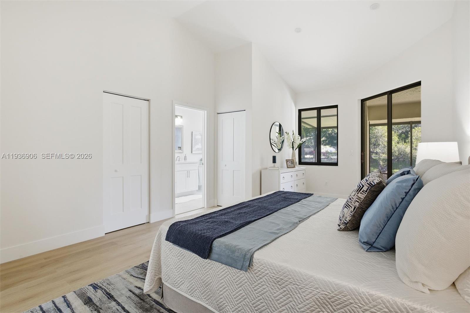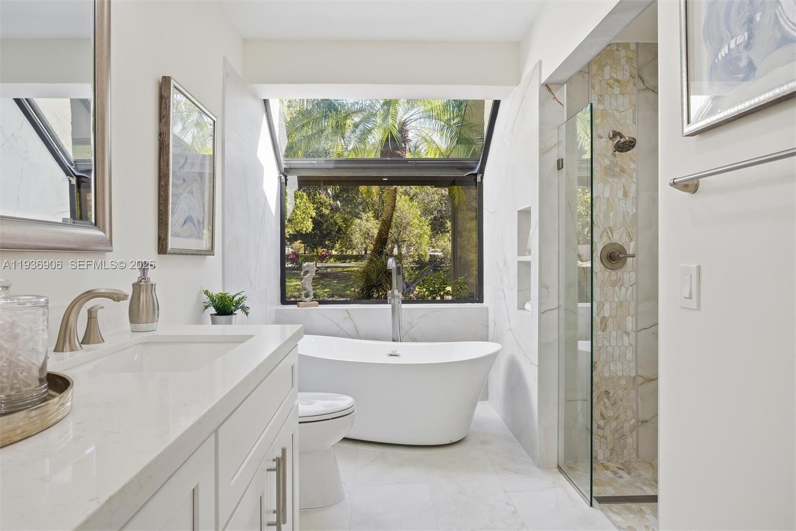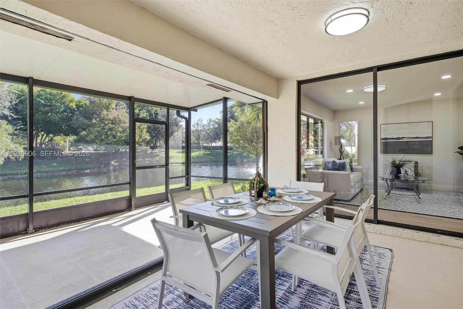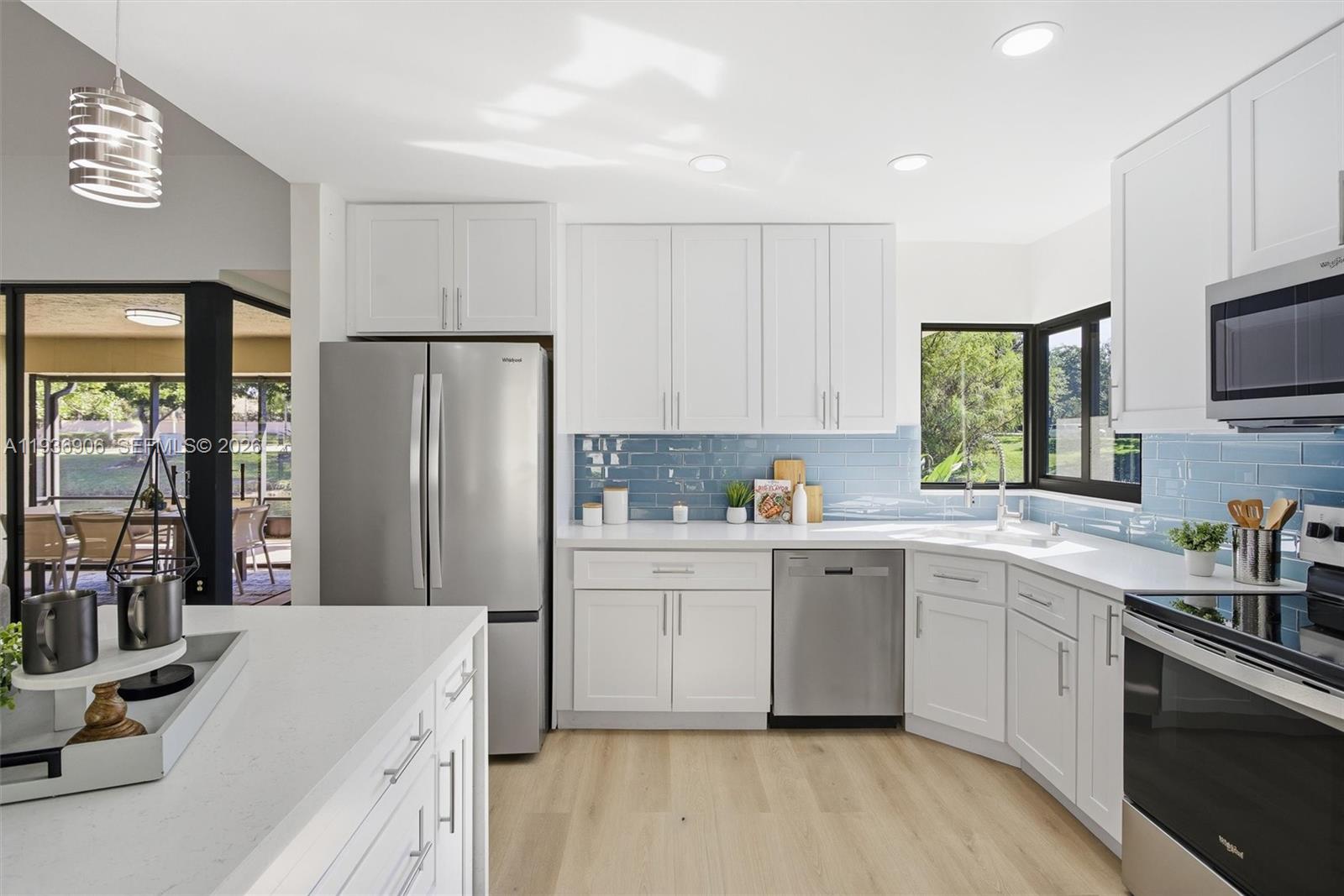 Rarely available & highly sought-after, this COMPLETELY RENOVATED, 1-STORY, END-UNIT LAKEFRONT VILLA in CHELSEA III at Jacaranda is a true standout. Offering 1,808 SF, 3 Bedrooms & 2 Baths, it feels like a single-family home, offering space, privacy, and effortless comfort at a fraction of the price. Thoughtfully remodeled in 2025, the home features a 4-YR-old ROOF, UPDATED PLUMBING, luxury vinyl plank flooring, an OPEN FLOOR PLAN and vaulted smooth ceilings with recessed LED lighting throughout. Sun-filled living, dining, and kitchen areas flow seamlessly—ideal for both everyday living & entertaining. The stunning kitchen showcases quartz countertops, white shaker wood cabinetry, brand-new stainless steel appliances, & an island with seating & integrated cabinetry for extra storage. The spa-inspired primary bath is a serene retreat with a freestanding soaking tub perfectly placed beside a distinctive window that captures soothing lake views and natural light alongside a frameless glass shower and dual sink vanity. Custom closet built-ins, a brand-new washer and dryer, and a sleek epoxy-finished 2-car garage enhance everyday convenience. An extended covered patio invites al fresco dining and relaxation to the soothing sounds of the lake fountain. Tucked at the end of a cul-de-sac, this exceptional home is ready to be enjoyed from day one—effortless living at its finest.