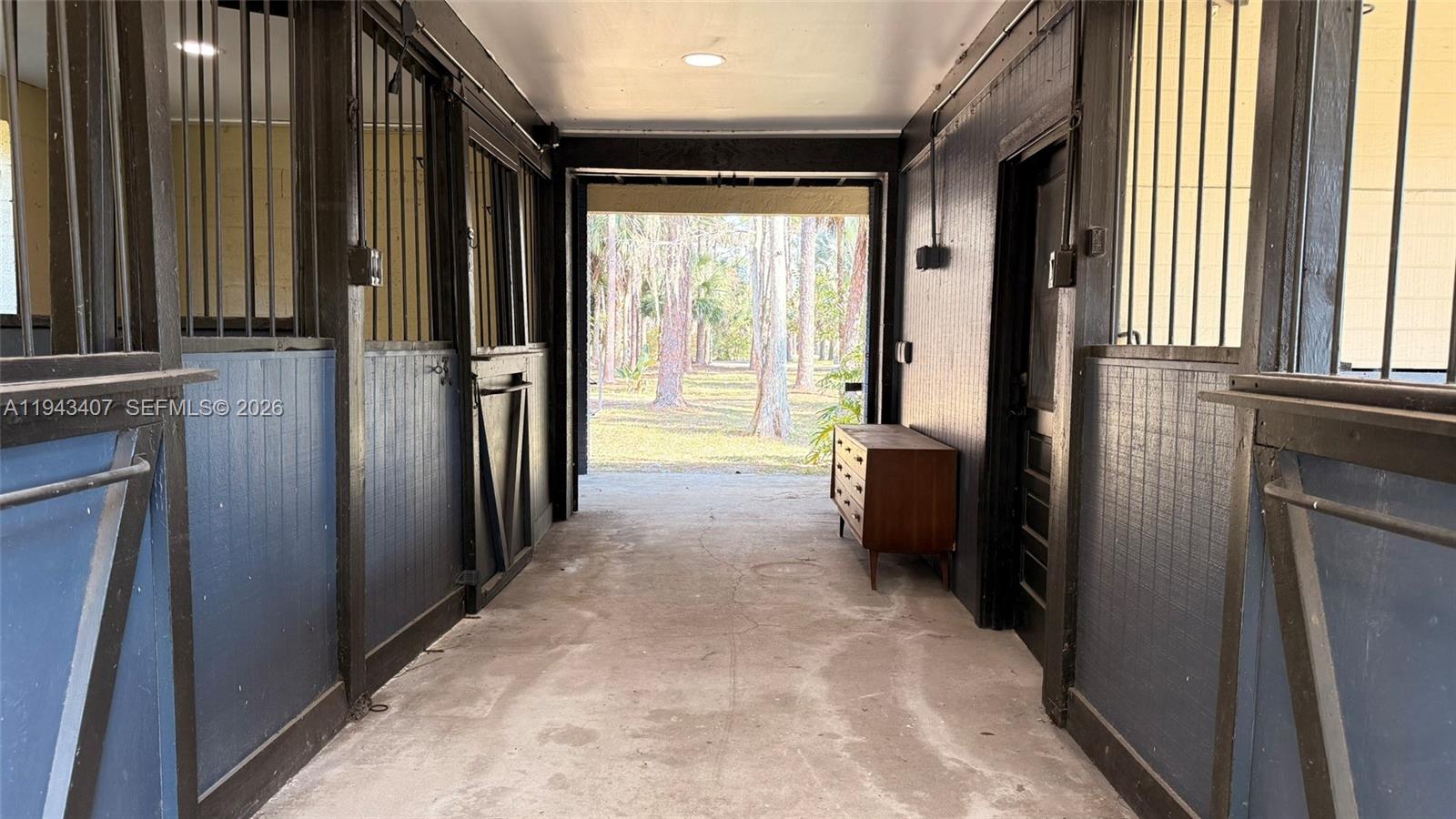 Distinctive Tudor-style estate set on 5 acres in the highly desirable Fox Trail Equestrian Community, where all homes sit on five-acre parcels, offering privacy and space. The main residence offers 2,560 sq ft under air and features three spacious master bedrooms, each with its own full bath and ample closet space, plus an additional half bathroom for guests. Skylights throughout the home flood the interiors with natural light and enhance the architectural character. Multiple sets of impact-rated French doors open to an extra-large screened-in pool surrounded by lush tropical vegetation, ideal for entertaining. A separate full bathroom serves the pool and stable area. The barn is very well maintained and includes three stalls and a tack room, with space for paddocks or an arena while preserving mature vegetation and pine trees. Above the barn, a light-filled 728 sq ft air-conditioned apartment offers privacy and flexibility, complete with living area, kitchen, bedroom, full bath, and laundry, and provides income potential, with seasonal or annual rental opportunities of up to $3,500 per month. Additional highlights include a new roof with transferable warranty,low HOA of $83/month, and approximately 16 miles of riding trails. Completely private yet minutes from shopping, dining, and Wellington’s equestrian venues. A rare opportunity to enjoy true luxury rural living in one of the fastest-growing, world-class counties in Florida, Palm Beach County.