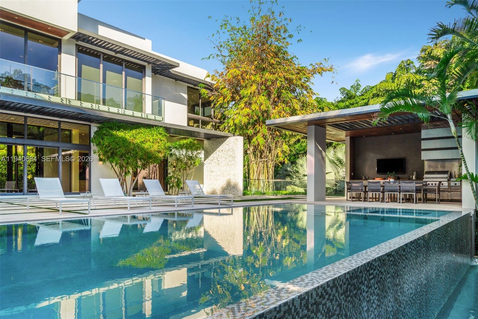 Designed by renowned architect Alberto Cordovez, this extraordinary Ponce Davis estate delivers nearly 10,000 SF under air on an expansive 45,302 SF lot. Featuring 7 bedrooms, 8 full baths, and 1 half bath, the residence blends striking modern architecture with resort-style living. A private gated drive leads to an oversized driveway and a 3-car garage with space for 3 additional car lifts, surrounded by lush tropical landscaping featuring bamboo and foxtail trees. Interiors showcase soaring ceilings, limestone and hardwood floors, fluted walls, integrated architectural ceiling system, custom Italian doors, elevator, Crestron automation, private movie theater, full gym, and multiple family and entertaining spaces—all bedrooms overlooking the pool. The chef’s Mia Cucina kitchen is equipped with Wolf and Sub-Zero appliances, double ovens, steam oven, wine room, and oversized island. Outdoors, enjoy covered terraces, summer kitchen, cabana, and a 20’ x 40’ saltwater infinity pool with spa and waterfall. A full-house generator, a full house water filtration system, advanced security, and premium systems complete this one-of-a-kind modern retreat.
