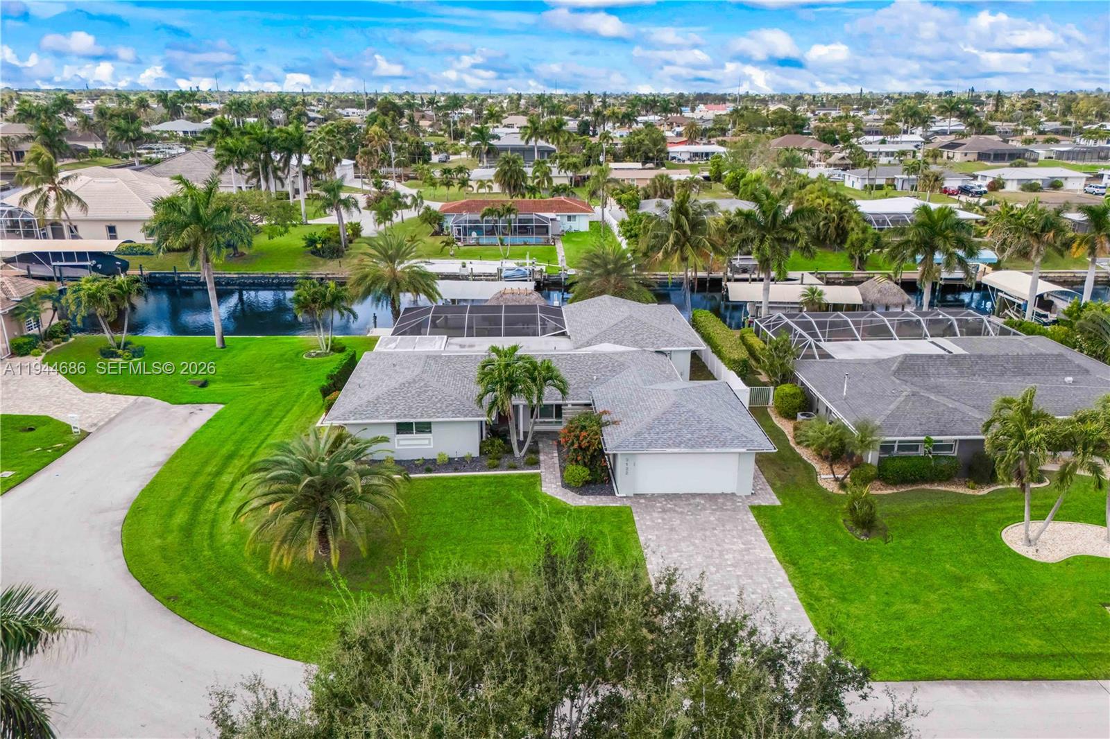 DIRECT BOAT ACCESS – MINUTES TO OPEN WATER! Nestled on a quiet cul-de-sac in the highly sought-after Gold Coast waterfront community, this beautifully maintained 3-bedroom, 3-bath pool home sits on an oversized direct-access lot with no bridges and quick Gulf access. Boating enthusiasts will appreciate the private dock with two boat lifts, complemented by a waterside tiki hut perfect for relaxing while enjoying peaceful canal views. Inside, the home features tile wood-look flooring throughout, upgraded lighting fixtures, and custom molding with architectural detailing. The updated kitchen offers wood cabinetry, granite countertops, stainless-steel appliances, and a built-in wine cooler, flowing seamlessly into the dining area highlighted by a wood-accent ceiling. Experience true Florida outdoor living with a raised screened lanai, a resort-style pool with sun shelf/ledge, and a fully equipped outdoor kitchen with built-in grill. A convenient pass-through to the sunroom enhances seamless indoor-outdoor connectivity. The primary suite provides a private retreat with a spa-inspired bathroom featuring a large walk-in shower, double vanity, and an expansive walk-in closet complete with a separate makeup vanity. One of the guest bedrooms is an ensuite, offering added comfort and privacy, while the third bedroom is ideal for guests or a home office.