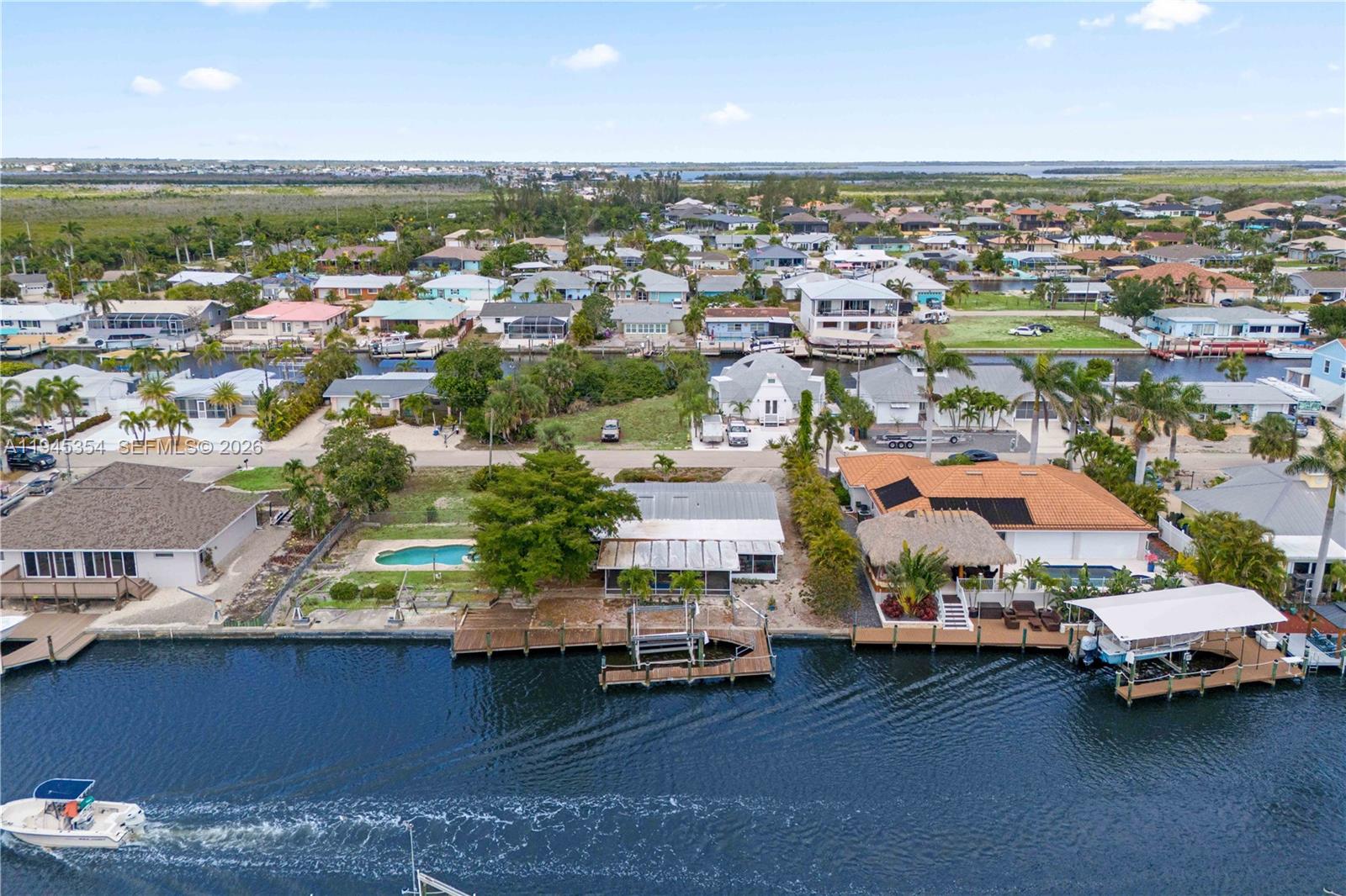 Welcome to the largest double lot in Matlacha—an incredibly rare opportunity to live on the water with wide-open views that stretch for miles. This expansive property offers unmatched space and potential in one of Florida’s most colorful and charming coastal communities. Multiple outdoor lanais and covered living areas provide plenty of room for entertaining or relaxing in the island breeze. Enjoy the pool, with ample room left to create the ultimate tropical retreat. A huge private dock extends into the water and includes a 63-foot boat dock with a 12,000 lb. capacity—perfect for serious boaters looking for quick access to the open water. The home itself has a spacious layout and good bones but would benefit from some updating. Still, it’s the lot that truly sets this property apart—double the size of most in Matlacha, with room to grow, incredible views, and endless waterfront possibilities. Don’t miss your chance to own this one-of-a-kind slice of paradise