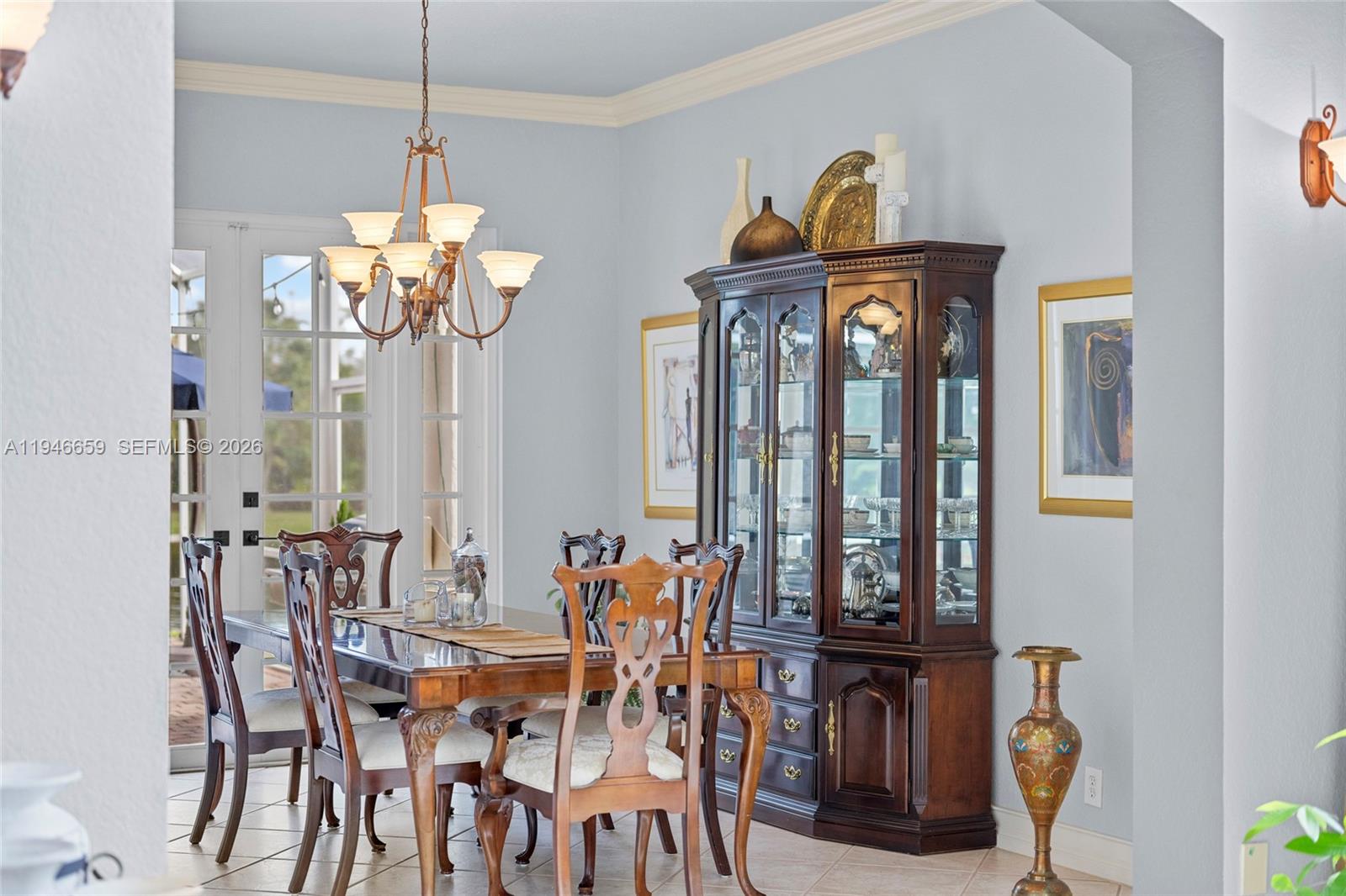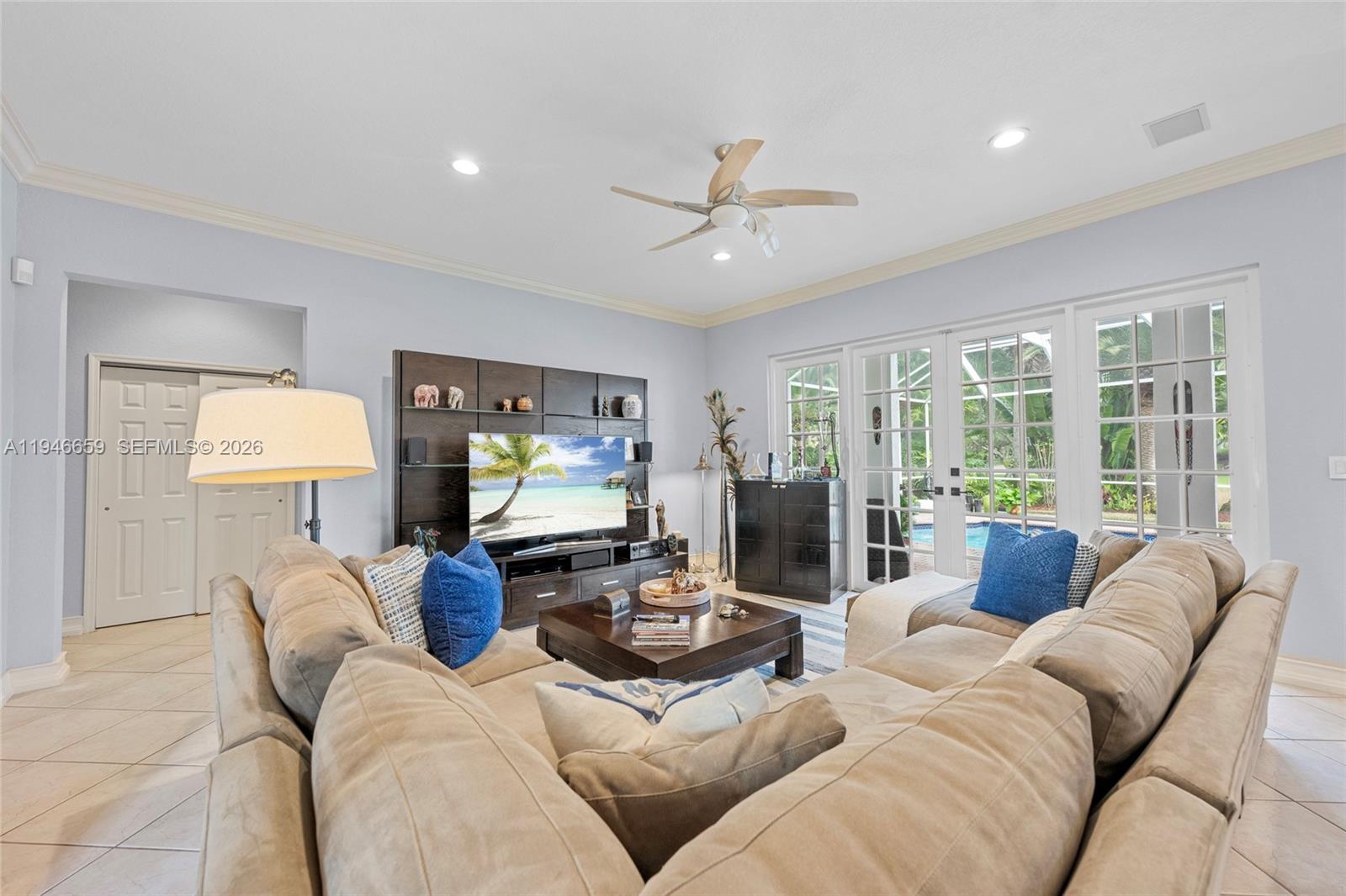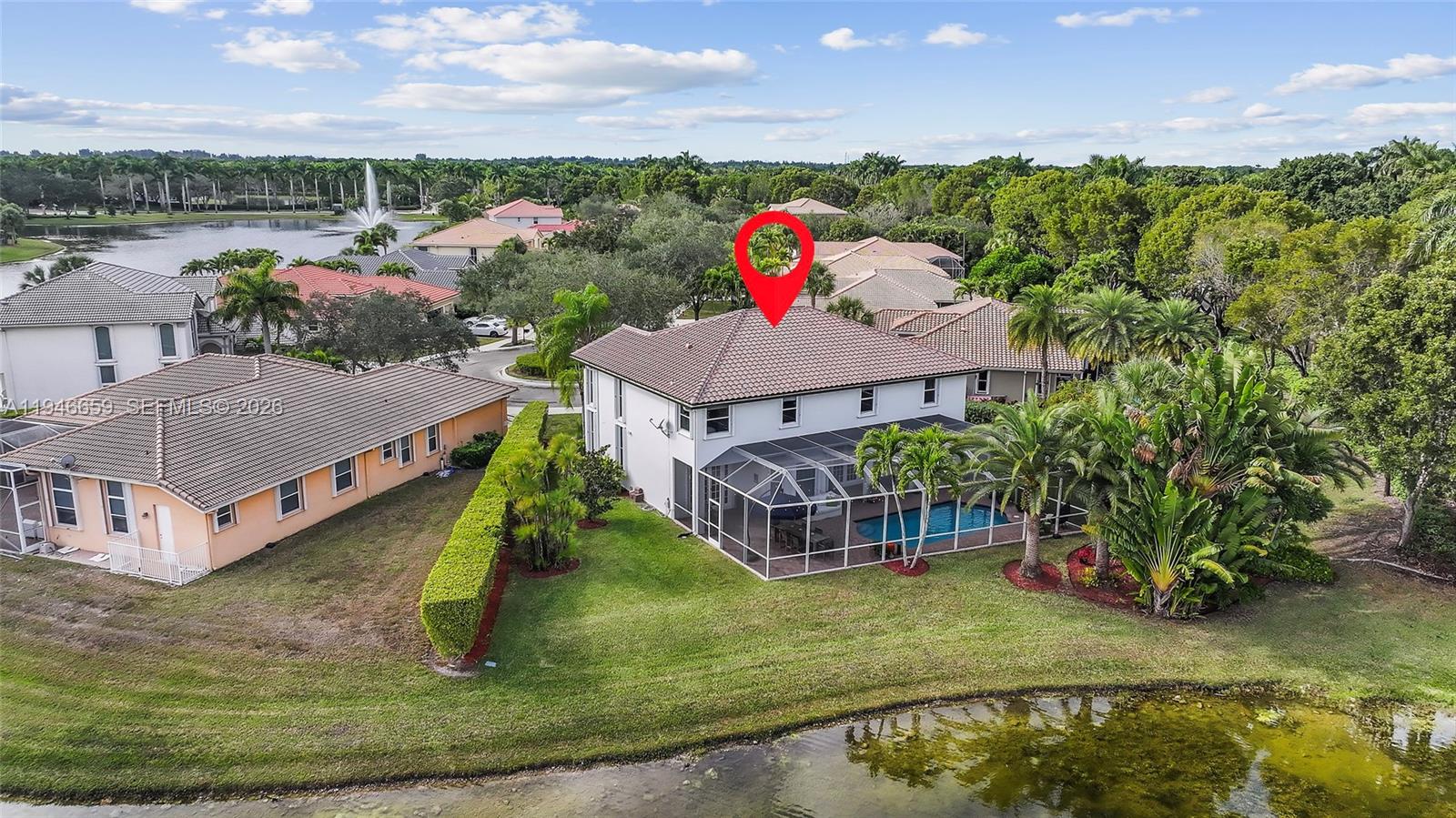 Remarkable home on a quiet cul-de-sac in exclusive Lake Ridge One enclave of 19 homes. This spacious two-story residence sits on a 15,000 sq ft lot with private water views and updated outdoor setting. Built in 1998, the home features 2025 roof with gutters, accordion hurricane protection (panels only on patio doors), and freshly painted exterior (2024). The screened patio, updated 2025, opens to a heated pool with paver deck and Diamond Brite finish (2023)—ideal for entertaining. Inside are five bedrooms + office and loft, four baths renovated with upscale fixtures and quartz countertops, and three-car garage. A first-floor bedroom with renovated cabana bath adds flexibility. The living room offers two-story ceilings, crown moldings, and stone floors on the main level, with wood flooring throughout bedrooms, loft, and staircase. The kitchen features white shaker cabinetry, center island, granite countertops, and stainless appliances including Thermador refrigerator, wall oven, convection microwave, downdraft vented cooktop, wine cooler and custom kitchen pantry. All closets are built out, and the laundry room includes newer cabinetry, countertops, and LG washer and dryer. Additional highlights include 2 A/C systems approx. 5 years old, water softener/filter, central vacuum, surround sound, Ring security, water heater (2 years old), and ADT alarm. The primary bath offers vessel tub, Moen smart shower, porcelain floors, and decorator lighting and window treatments.