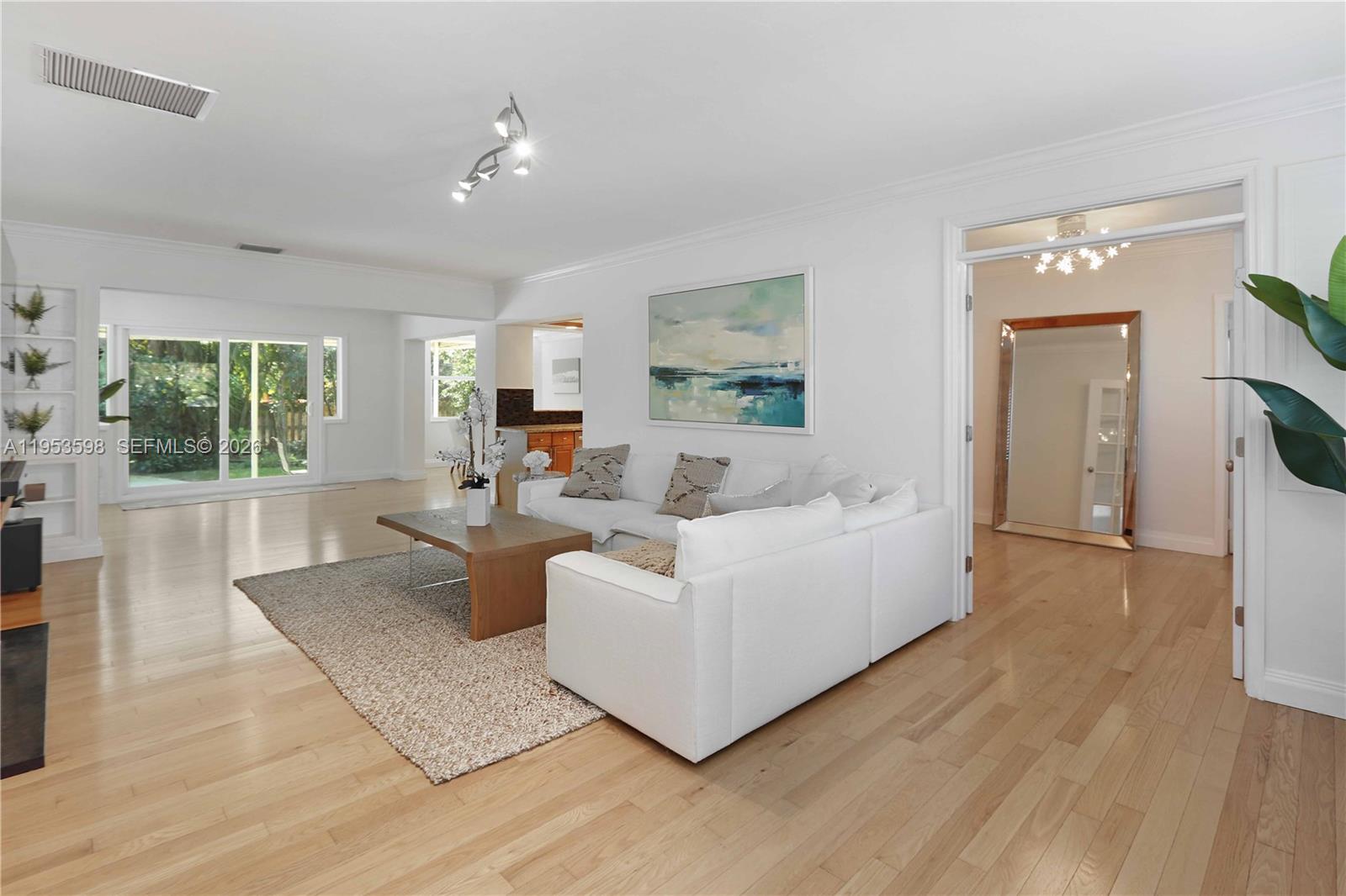 Located in the highly sought-after Hollywood Lakes neighborhood, this beautifully maintained 3-bedroom, 3-bath pool home sits on a rare double lot, offering an exceptional blend of space, comfort, and South Florida lifestyle. The home features a bright, open floor plan with wood flooring and crown molding throughout, creating a warm and inviting atmosphere. A separate den with French doors provides flexible living space ideal for a home office, media room, or guest area. The kitchen is thoughtfully designed with stainless steel appliances, an oversized refrigerator, and seamless flow into the spacious family room. Expansive windows and double French doors frame tranquil views of the pool and open fully to the outdoor deck, allowing for effortless indoor-outdoor living and entertaining. A circular driveway provides ample parking, while the private backyard offers a true tropical retreat with a resort-style pool and expansive deck, ideal for entertaining or enjoying peaceful outdoor living. This energy-efficient home includes all hurricane impact windows, a 3-year-old metal roof, solar panels, a new pool pump, and new pool deck and pavers completed in 2025. Ideally situated just blocks from Hollywood’s main shops, minutes from the beach, and only two blocks from the golf club, the location is truly unbeatable.