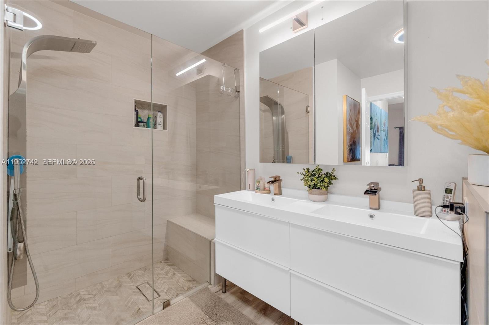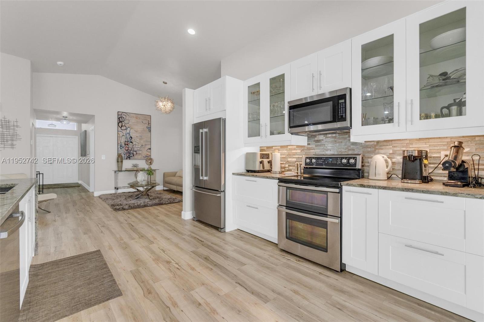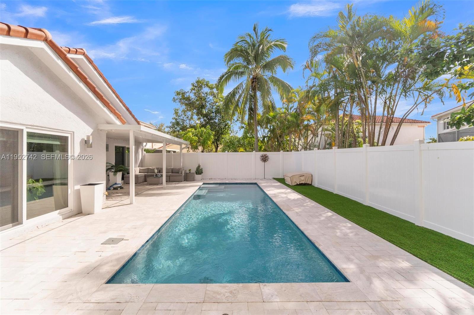 BEAUTIFULLY UPDATED BY A PROFESSIONAL DESIGNER, this 3-bedroom, 2-bath single-family home offers the perfect blend of style, comfort, & South Florida living. The bright, open layout features smooth vaulted ceilings, recessed lighting, wood-like vinyl flooring, clean lines, & a cohesive modern design that flows effortlessly from the living & dining areas into the kitchen. The kitchen boasts custom cabinetry, S.S. appliances, waterfall style island, & premium appliances, ideal for everyday living & entertaining. Primary suite is a private retreat with direct patio access, & a spa-inspired bath, while two additional bedrooms (opposite end of primary) offer flexibility for family, guests, or a home office. Both bathrooms are tastefully renovated with modern finishes. Step outside to your own resort-style oasis featuring a NEWLY CONSTRUCTED SALTWATER POOL, custom patio, & beautifully designed outdoor space w/ NEW PVC PRIVACY FENCE (all in 2023) -perfect for relaxing, hosting, & enjoying the Florida lifestyle year-round. NEW 2024 BARREL TILE ROOF, COMPLETE IMPACT WINDOWS & DOORS, & NEWER 2020 HVAC. Non-Flood Zone & low HOA dues. This move-in-ready home delivers turnkey luxury, thoughtful design, & exceptional indoor-outdoor living. DON'T REGRET LETTING THIS ONE GET AWAY!