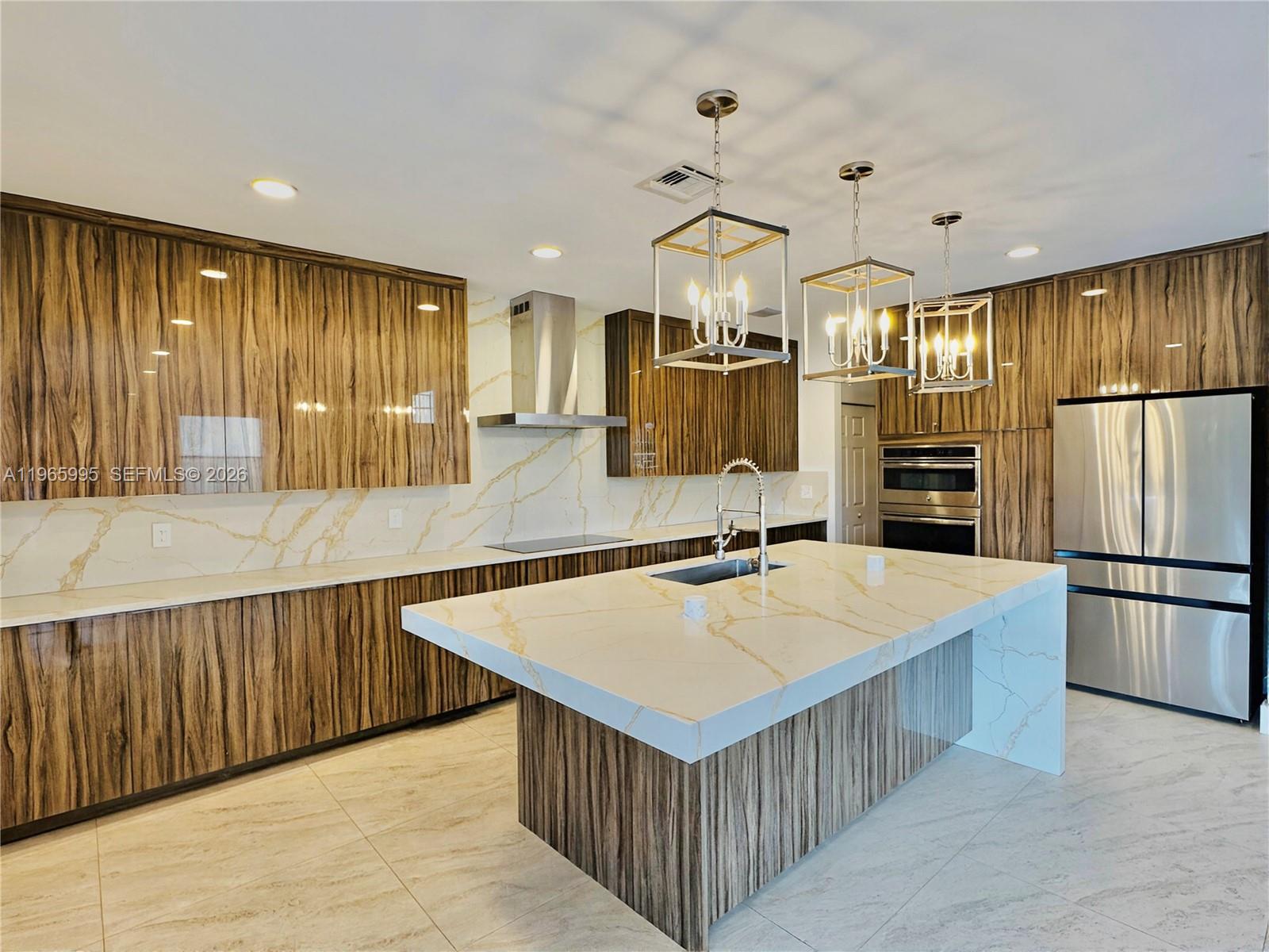 This is the one you don't want to miss! A Fully renovated 4 bedroom, 2.5 bathroom residence in the exclusive community of Olympia! 9083 boasts an array of high-end features, sitting on a massive 7,814sqft lot perfectly situated in front of a beautiful nature preserve. Featuring 3,158 total sqft w/ Soaring 20 Foot Ceilings, a new Water Heater, Tesla EV charger & Generator! Step into a world of elegance w/ Custom high-gloss European cabinetry, GE Stainless Appliances, exquisite Gold Vein Calacatta Quartz, a 4-inch mitered edge island w/ built in wireless charging stations, Navona stone floors and Hardwood Staircase. Outside in your private fenced in backyard you will enjoy a functional Wet Bar and delicious Coconuts, Mangos, Avocados, Papaya, Bananas, Herbs and Limes!