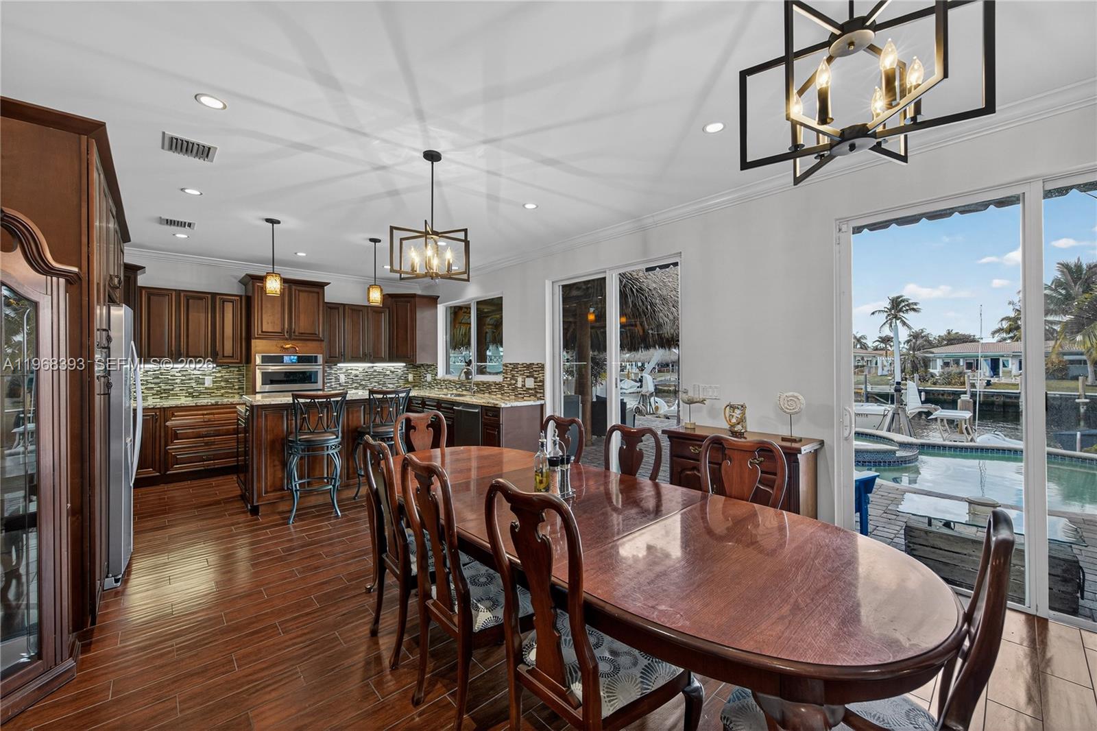 Exceptional wide-canal waterfront residence located at the end of a cul-de-sac in Garden Isles, offering breathtaking water views and outstanding ocean access. This beautifully maintained property features extensive upgrades throughout. Recent improvements include a 2025 metal roof with warranty, significant seawall and dock enhancements, a new floating dock (2025), custom impact windows and doors, PVC plumbing from the home to the street, central vacuum system, full-house generator (excluding A/C), tankless water heater, and professionally designed landscaping. The backyard provides a serene, resort-style setting with a pool, spa, tiki hut, and expansive paver decking—ideal for both relaxation and entertaining. Boasting 70 feet of waterfront on a desirable street within a quiet, family-friendly neighborhood, this property represents an exceptional opportunity. A truly remarkable home that must be seen and will not last!