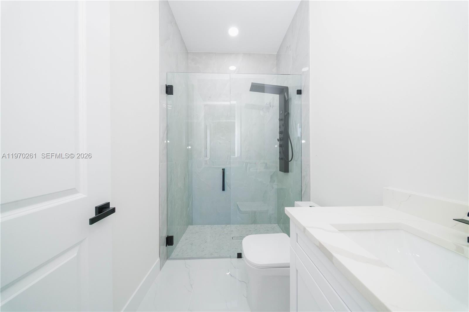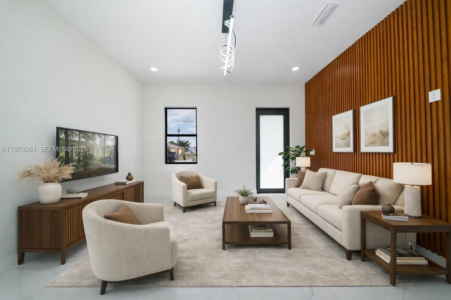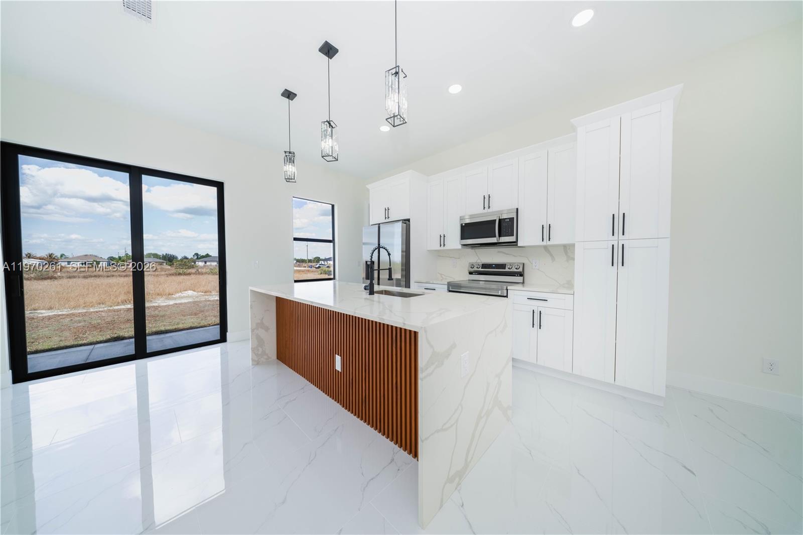 3-bedroom, 2-bath home with tile flooring throughout and a bright, modern layout. The kitchen features a quartz waterfall island, wood-panel backsplash, and clean contemporary finishes. Both bathrooms are finished with quartz, with a tiled shower and glass enclosure. Impact windows and doors add durability and peace of mind. Enjoy the convenience of an in-ground sprinkler system and an attached 1-car garage.