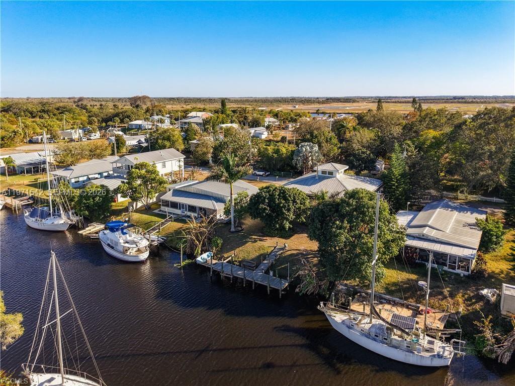 Waterfront Retreat in Turkey Creek – Gateway to Florida’s Legendary Waterways! Tucked away in the distinctive boating community of Turkey Creek, an Ortona subdivision adjacent to the historic Ortona Locks, offers an authentic Old Florida lifestyle with exceptional boating access. Set on a 65’ x 100’ deep-water canal lot, the property features a sturdy dock equipped with water and electric, providing effortless access to the Caloosahatchee River, part of the Intracoastal Waterway. The wood-frame home is elevated on a solid concrete block foundation with concrete pilings and topped with a durable metal galvalume roof. The upper level offers approximately 1,300+/- square feet, featuring two bedrooms, one bath, a galley kitchen, and a spacious great room for living and dining. The heart of the home is the dramatic living area, highlighted by a rustic tongue-and-groove vaulted wood ceiling, a cozy Franklin stove, and expansive sliding glass doors that open to a second-living-room-sized screened porch—perfect for relaxing while taking in tranquil canal and waterfront views. The lower level includes a garage, a workshop with built-in workbench and generous storage for projects, a laundry area, and a second full bath. Conveniently located just 15 minutes from downtown LaBelle and 20 minutes from downtown Moore Haven, this unique waterfront retreat truly delivers on the promise to slow down, simplify, and savor life on the water.