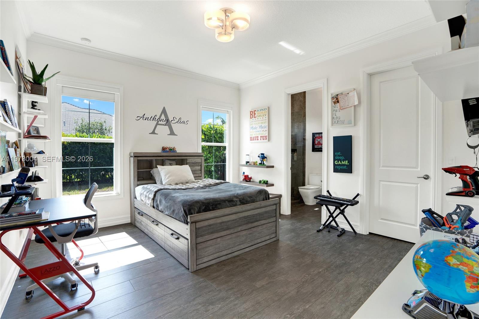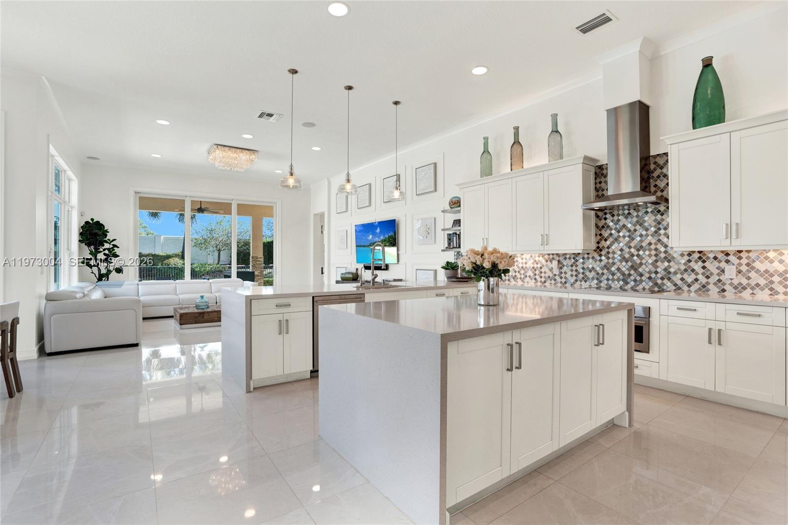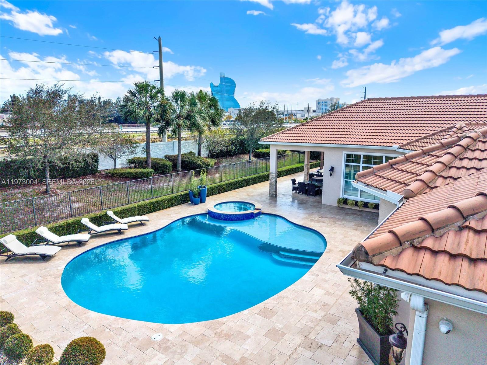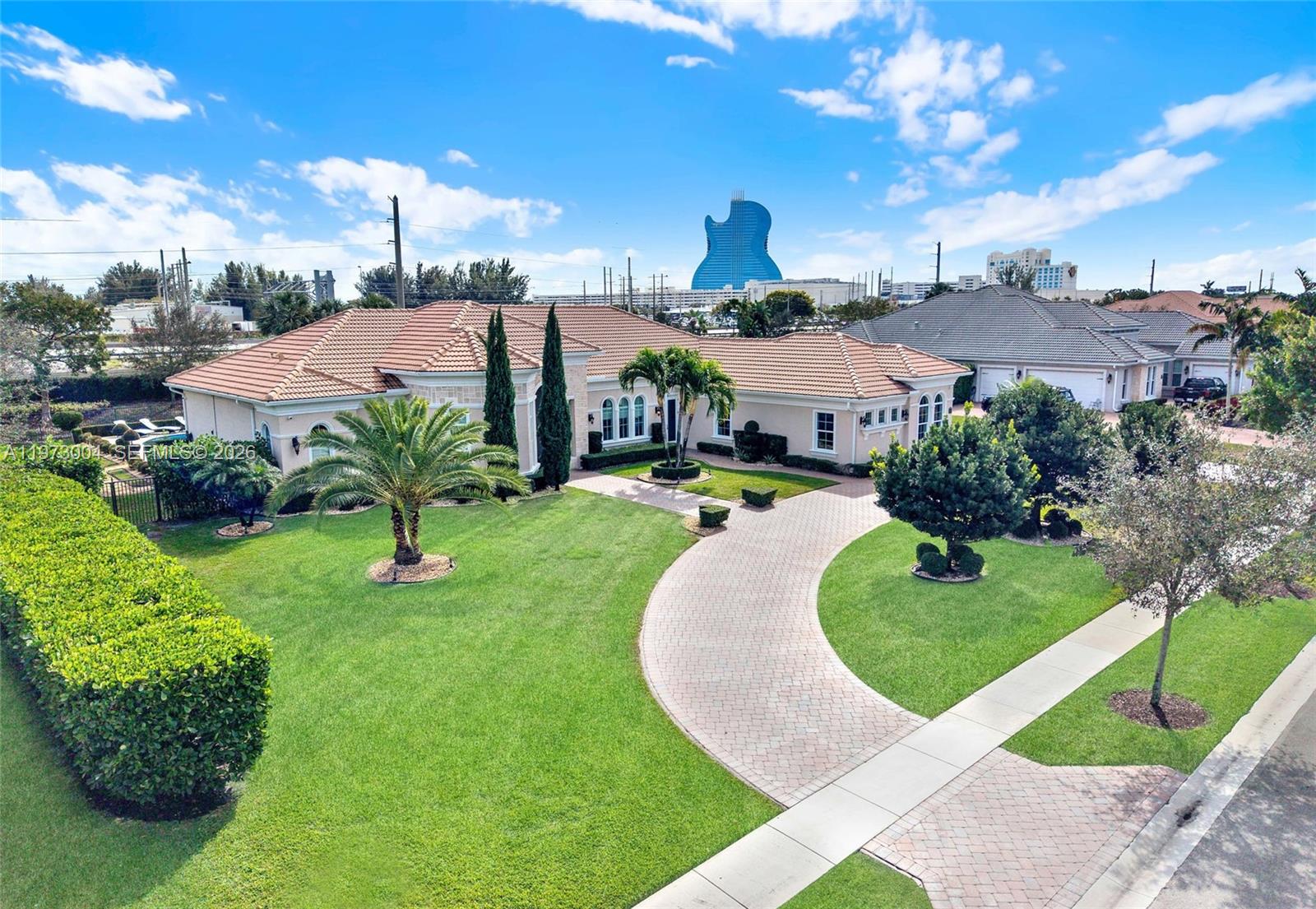 Located in the prestigious gated community of Sterling Ranch, this custom single-story estate offers refined design and effortless indoor-outdoor living with a direct view of the Hardrock Guitar Hotel. A grand circular paver driveway and manicured landscaping create striking curb appeal and plenty of parking. Inside, 12-foot soaring ceilings, polished stone floors, and expansive windows fill the home with natural light. The open-concept layout features a seamless flow into the chef’s kitchen oversized quartz islands, custom cabinetry, stainless steel appliances, double ovens, wine refrigeration. The primary suite overlooks the pool and features a spa-inspired bath with dual floating vanities, freestanding soaking tub, and oversized glass shower. Secondary bedrooms are generously sized while each additional bedroom includes its own ensuite bath for exceptional comfort and privacy. Step outside to a resort-style backyard with freeform pool, integrated spa, expansive travertine decking, and covered lanai. Lush hedging provides privacy while maintaining an open feel. Additional upgrades include a whole-home water filtration and softener system, central vacuum, tankless water heater, impact windows and doors, a circular paver driveway, and a three-car garage for extensive parking. Ideally located minutes from the Turnpike, I-95, I-75, Fort Lauderdale Airport, this home delivers luxury, convenience, and lifestyle in one package. HOA includes all landscaping, trimming and mowing.