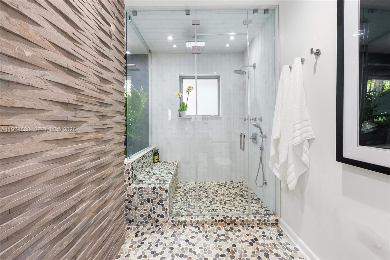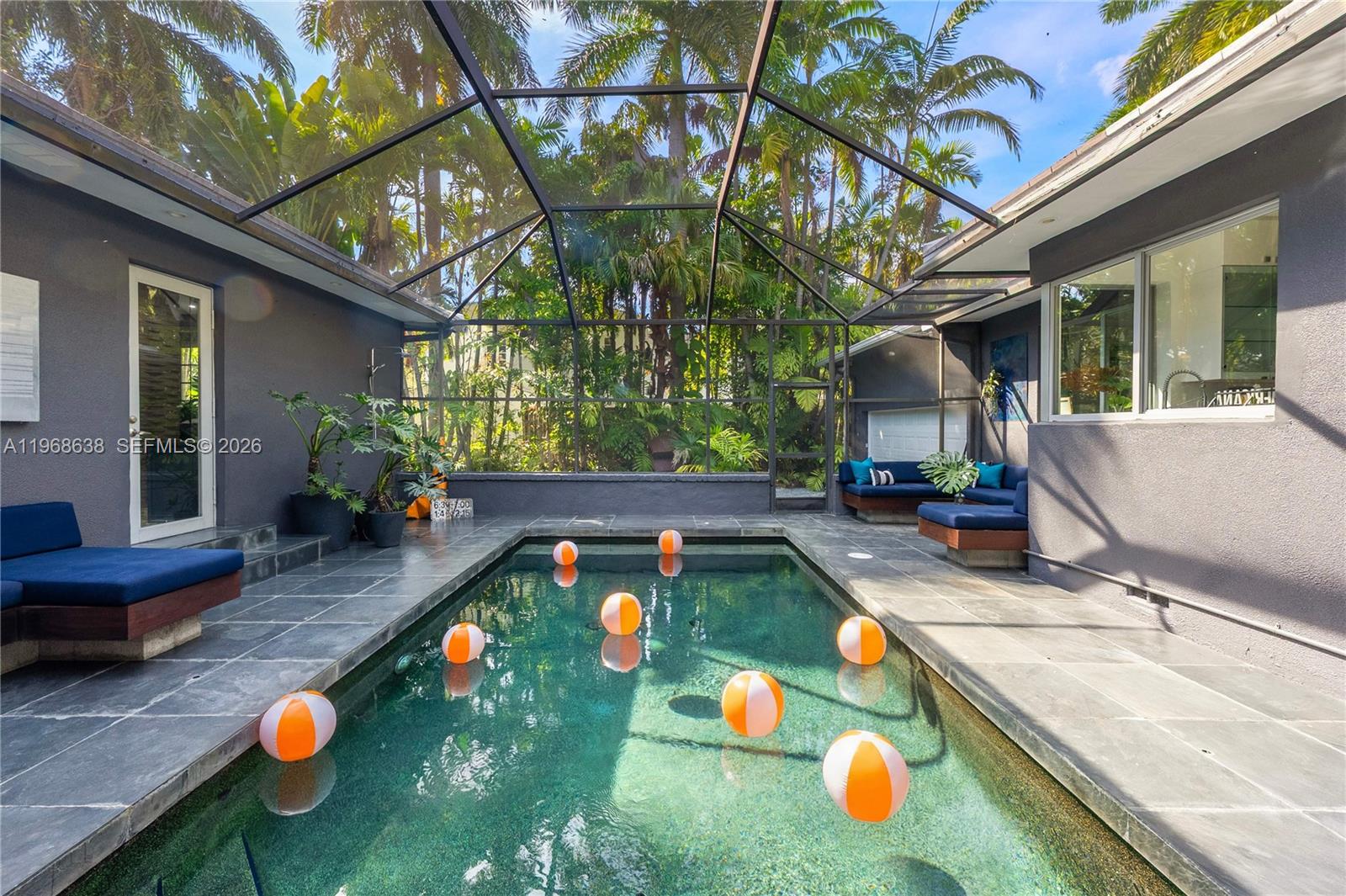 Set on one of the most coveted streets in guard-gated Morningside, this architectural gem rests on an expansive 12,633 sq. ft. corner lot enveloped in lush tropical foliage with serene garden vistas visible from every room. Across from the bay in the heart of Miami’s Upper Eastside, the residence embodies the optimism and flow of original Mid-Century design. The wood & brick paneled living room anchors the home with warmth, comfort and texture. Walls of floor-to-ceiling glass dissolve the boundary between interior and landscape. High ceilings amplify the sense of volume and light, illuminating black terrazzo floors, and sculptural architectural gestures. The covered, private pool is one of them. Every detail and room reinforces the home’s as a place for creating new memories for you and your guests.