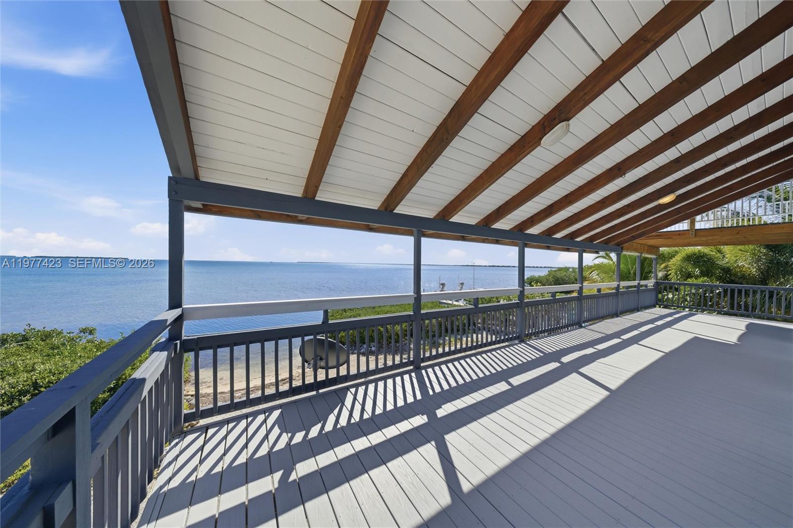 This striking 4-bedroom, 3-bathroom home is a testament to coastal architecture, blending rustic design with open, light-filled living spaces that showcase a breathtaking oceanfront setting. Situated on a double lot totaling .32 acres, the property offers an impressive 120 feet of frontage overlooking Cudjoe Bay—creating a rare and commanding presence along the shoreline. Broad covered balconies and generous outdoor living spaces capture the essence of Keys waterfront living, while large impact glass doors and windows frame sweeping ocean views and invite natural light throughout. Soaring ceilings with dark wood beams enhance the open-concept layout and add dramatic architectural character. The main living level features a fully renovated kitchen, dining area, expansive living room, laundry, two bedrooms, and two bathrooms. Upstairs, a third bedroom sits at the top of the stairs, while a catwalk leads to the fourth bedroom with an ensuite bath and walkout deck positioned to capture the home’s most spectacular panoramic views. Throughout the residence, thoughtful design blends contrasts—modern lines with traditional warmth, cozy intimacy within spacious rooms. Whimsical and eclectic touches pair with bold architectural elements, creating a home that feels both artistic and inviting while celebrating its extraordinary oceanfront setting.