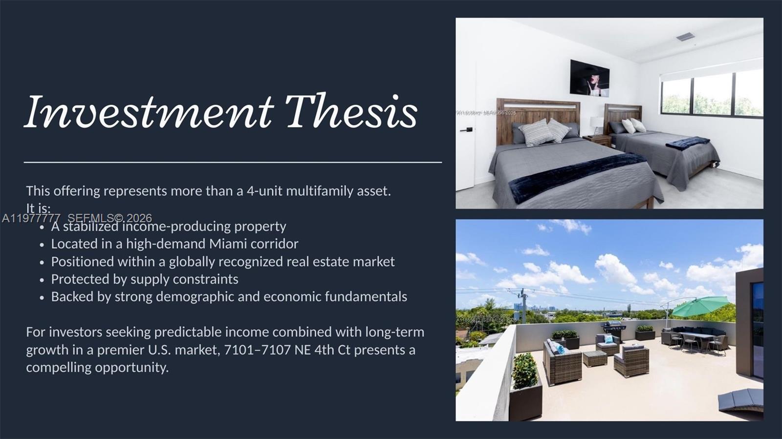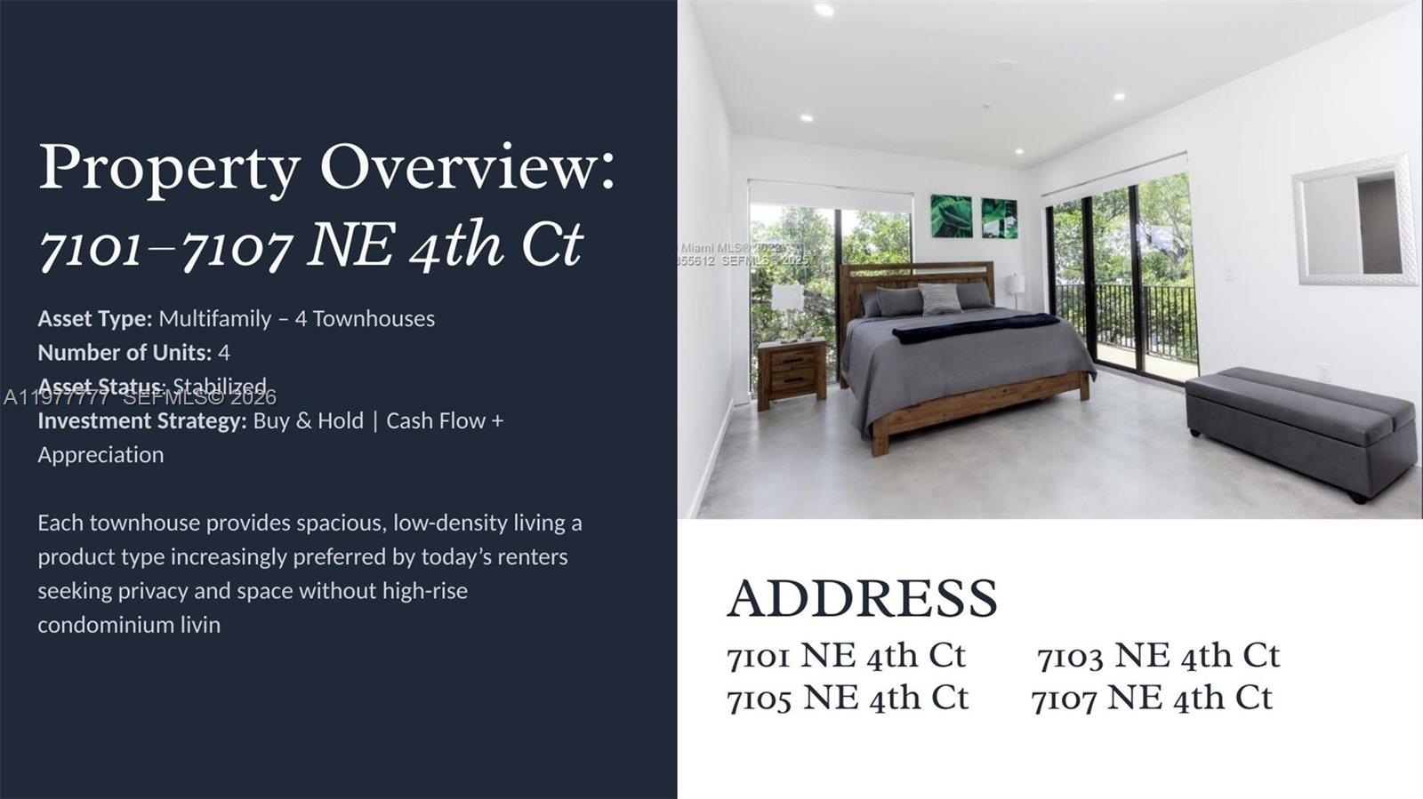 Rare investment opportunity you don’t want to miss! This offering includes the entire project of four townhouses (7101–7107 NE 4th Ct) being sold together as a complete multifamily asset. Perfect for investors seeking strong cash flow and long-term appreciation in a low-density product highly desirable to today’s renters. Properties like this rarely come to market as a package. For more details, financials, and additional information, please contact the listing agent directly
