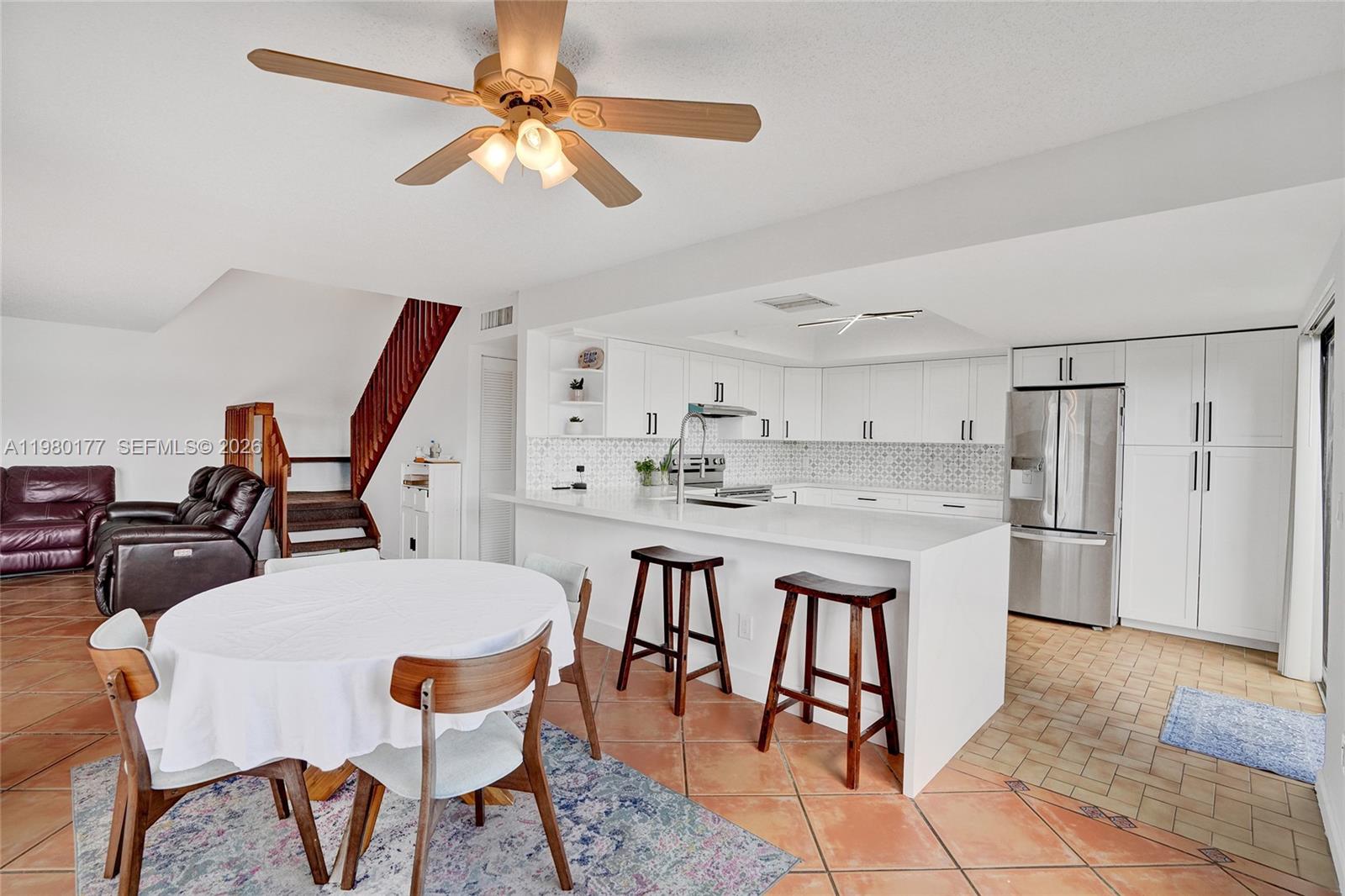 Welcome to this charming 2-bedroom, 1.5-bathroom two-story townhouse in the highly sought-after Lakes of the Meadow community in West Kendall. The showpiece of this home is the stunning fully renovated kitchen featuring white shaker cabinetry, quartz countertops, a geometric tile backsplash, stainless steel appliances, modern light fixtures, and a breakfast bar perfect for entertaining. The open-concept first floor offers a spacious living room with soaring ceilings and a generous dining area that flows seamlessly into the kitchen. Sliding glass doors lead to a private fenced backyard with a patio and turf, ideal for grilling, relaxing, or outdoor play. A convenient half bath completes the first floor. Upstairs, two well-sized bedrooms feature plush carpeting and abundant natural light. The primary bedroom boasts a walk-in closet and a private balcony with community views. Both bedrooms share a full bathroom with ample vanity space. Lakes of the Meadow is one of West Kendall's most desirable communities, offering resort-style amenities including a swimming pool, fitness center, clubhouse, tennis, racquetball, basketball, and pickleball courts, children's playgrounds, jogging paths, and scenic lakes, all with 24-hour security patrol. Conveniently located near top-rated schools including Jane S. Roberts K-8, major highways, shopping centers, and restaurants. Pet-friendly community. Don't miss this opportunity!