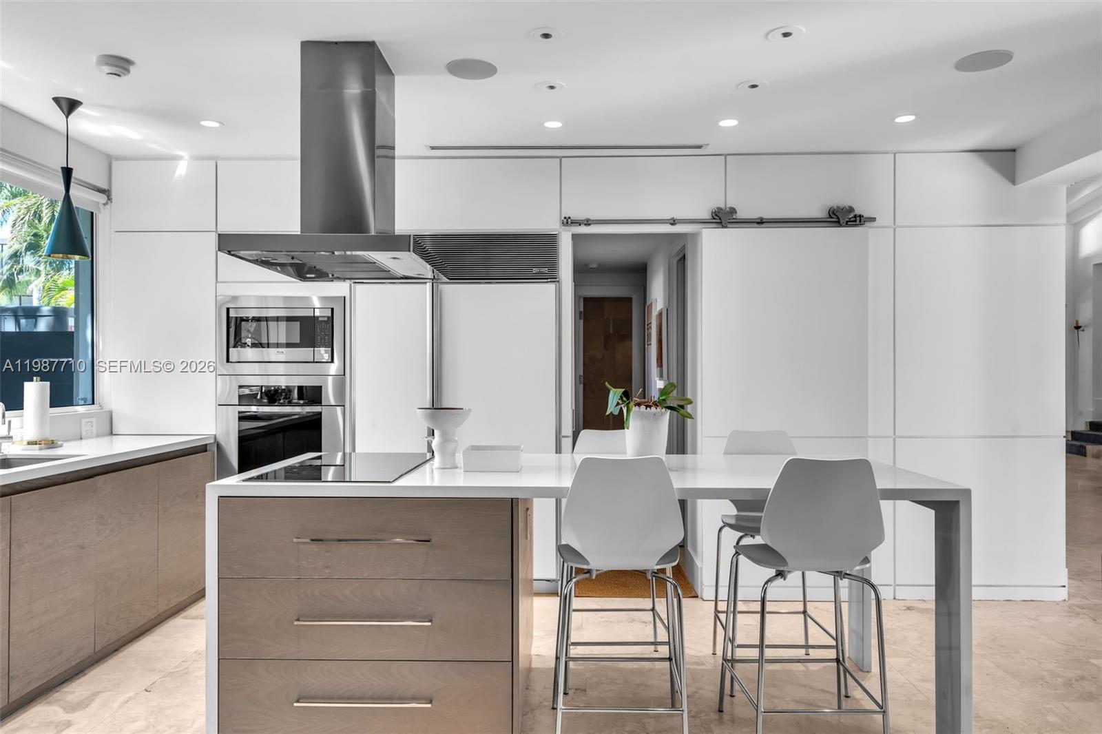 Sophisticated Mediterranean beach house, elevated and privately set, offering 5 bedrooms, 5 bathrooms, and an additional powder room, surrounded by a lush, mature backyard garden. A double-height cathedral ceiling in the great room fills the home with natural light and opens to a covered terrace overlooking the pool patio, creating seamless indoor-outdoor living. The great room flows into a warm family room and gourmet kitchen, well suited for everyday living and entertaining, and every bedroom is en suite. The serene primary suite includes a sitting area ideal for relaxing or reading. A spacious den with abundant windows and its own full bath offers flexibility as a home office, guest suite, studio, or cabana, with direct access to the patio and pool. Outdoors, enjoy a private setting with an upper veranda shaded by a living canopy of fig vines, an inviting space for dining and lounging, plus an outdoor gourmet area with a wood-fired pizza oven and tools. Additional highlights include solar panels with backup batteries for energy savings and reliability. Two batteries plus potential for expansion, two garages, and a pool with refreshed tile and grout for a crisp, updated finish. Walking distance to the beach, parks, dining, shopping, and everyday conveniences, with convenient access to Miami. Not Included in the sale: all display shelving, two bronze candle holders, and the chandelier hanging between the two bedrooms on the second floor.
