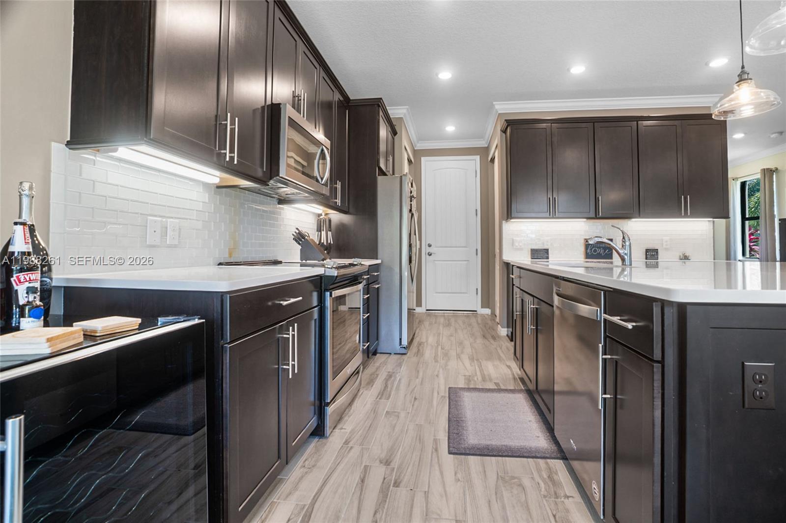 Beautiful corner-unit townhouse offering 3 bedrooms, 2.5 bathrooms, and a 2-car garage, enhanced with numerous high-end upgrades throughout. The home features a modern gourmet kitchen with 42” cabinetry, crown molding, under-cabinet lighting, subway tile backsplash, premium stainless steel appliances, and a stunning quartz island with pendant lighting that opens seamlessly to the main living space. Upstairs, the spacious primary suite serves as a private retreat with dual walk-in closets and an en-suite bathroom. Two additional bedrooms share a full bathroom with a tub/shower combination. The laundry room is conveniently located on the second floor for added ease. Additional upgrades include 8-foot solid interior doors, hurricane-impact windows and doors, designer staircase railing, coffered ceilings, recessed lighting, crown molding, and pre-wiring for a wall-mounted TV. Located in the highly desirable gated community of The Fields at Gulfstream Polo, residents enjoy access to two clubhouses and resort-style amenities including a pool, lap pool, spa, state-of-the-art fitness center, tennis, pickleball, and basketball courts, playground, and outdoor gathering areas. Ideally situated near top-rated schools, shopping, dining, I-95, Florida’s Turnpike, and just minutes from the beach. This move-in ready home is a must-see.