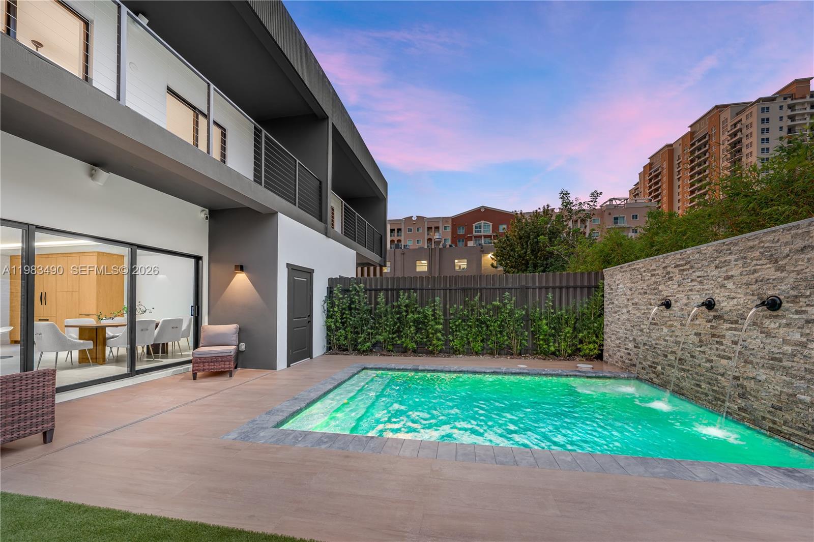 New construction townhome showcasing exceptional craftsmanship and premium finishes throughout. Featuring Serene townhouse 4 bedrooms and 4.5 bathrooms, including a cabana bath, with 2,750 SF under A/C. The open-concept layout is anchored by a designer kitchen with quartzite Bianco Superiore countertops, Porcelana Calacatta Borghini surfaces, custom white oak and hardwood cabinetry, and Bosch appliances. Italian Venice Blanco porcelain flooring flows throughout, complemented by Spanish larch wood accent walls that add warmth and texture. Built-in closets in all bedrooms. Spa-inspired bathrooms include Hansgrohe and Symmons fixtures, LED mirrors, rain shower heads, Kohler toilets, and Sitka soaking tubs for a refined, relaxing feel. Smart home features include Ring-integrated CCTV, outdoor audio, an irrigation system, and pre-wiring for full automation. The outdoor space is designed for entertaining, complete with a saltwater heated pool, WiFi-controlled spa jets, a Coyote summer kitchen, and a Spanish porcelain Augusta pool deck. Additional highlights include Masonite fiberglass entry doors, soft-closing garage doors, and an extensive drainage system for added peace of mind. Ideally located near Brickell, Coconut Grove, and Coral Gables with convenient access to top dining, shopping, parks, and major highways.