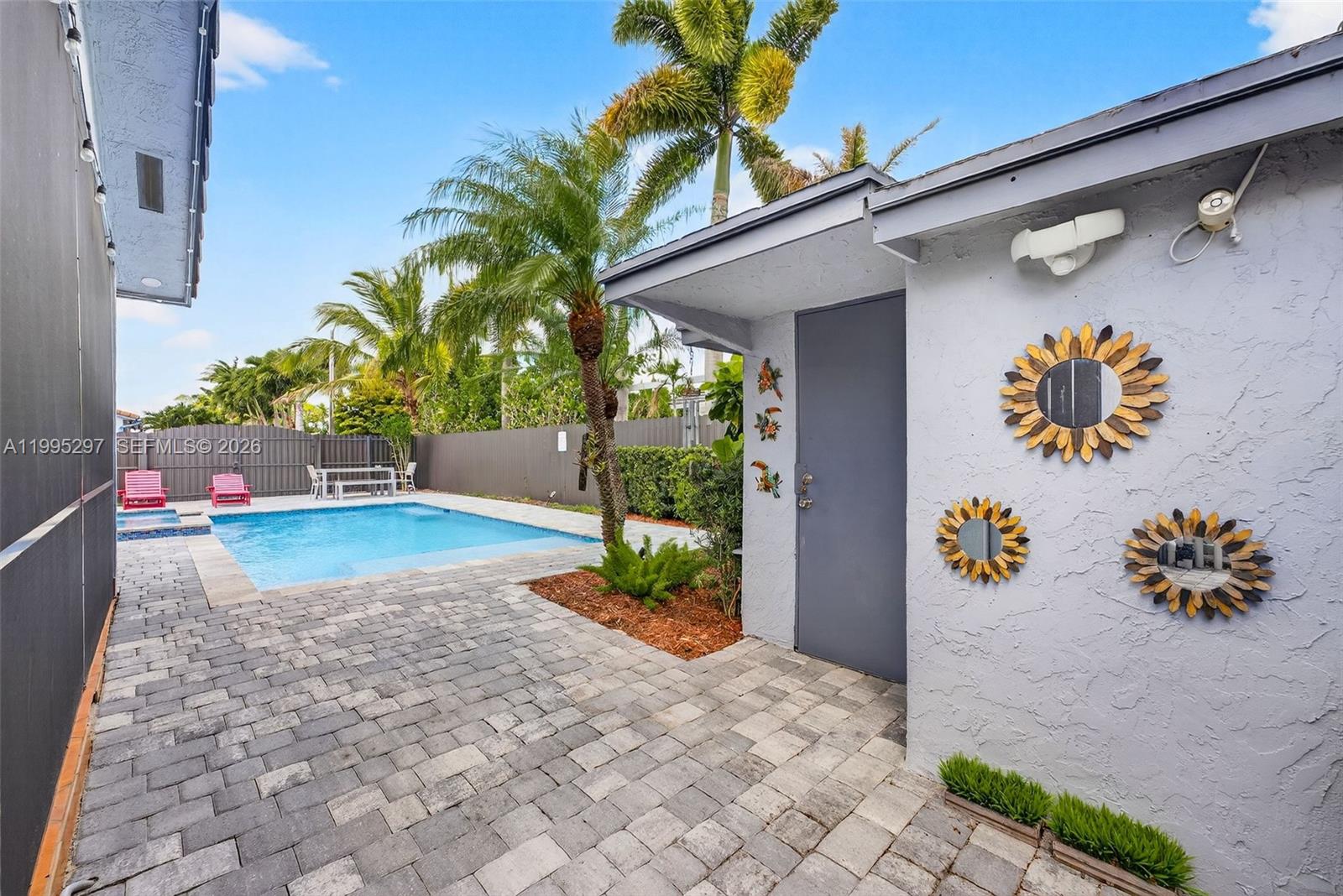 Exceptional opportunity in Mayte Subdivision (33187). Corner lot home with a large backyard designed for true outdoor living. The fully paved backyard features a saltwater heated pool with jacuzzi (2022), recently built and ideal for entertaining or enjoying South Florida weather year-round. The property also includes a newer deck and driveway (2022), a fully fenced yard, and a solid concrete structure perfect for storage or workspace. The lot offers ample parking for 4+ cars, plus side access ideal for a boat, trailer, or additional vehicles. Inside, the home offers a flexible layout with an additional living area and kitchenette, ideal for extended family or guests. The main living area provides comfortable living and dining spaces with a functional layout. Additional features include impact front and patio doors, accordion shutters, and a well-maintained roof. Conveniently located near major roads, shopping, dining, and schools. Priced to sell. All offers welcome.
