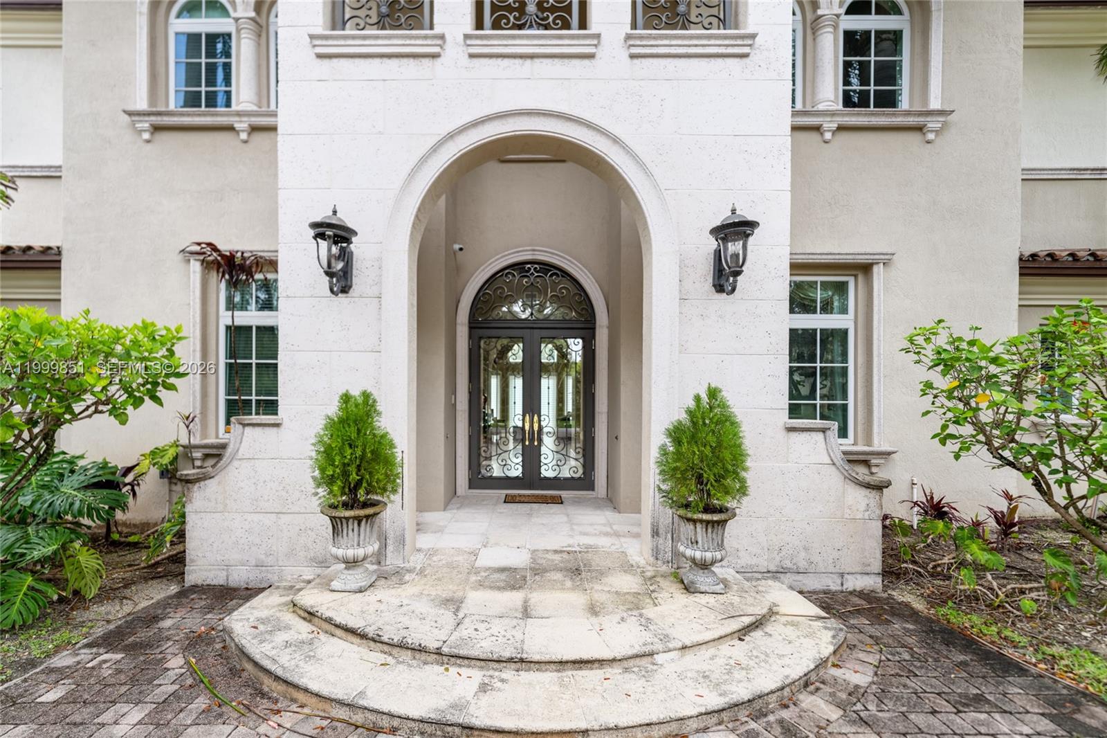 A statement of timeless elegance and architectural grandeur, this Mediterranean-inspired estate welcomes you through a gated entrance framed by majestic royal palms and a sweeping circular driveway. The striking façade showcases symmetrical design, arched windows, and a second-story balcony that sets an impressive tone of refinement. Step inside to a breathtaking double-height foyer featuring a dramatic curved staircase with wrought-iron detailing, gleaming marble floors, and a grand arched entry door that fills the space with natural light. Every element reflects meticulous craftsmanship and a sense of arrival. The main living areas are designed for both comfort and sophisticated entertaining, highlighted by soaring ceilings, expansive open spaces, and elegant archways that seamlessly connect each room. The formal living room exudes warmth and luxury, complemented by a second-floor balcony overlook that enhances the home’s open, airy ambiance. Architectural details such as custom iron railings, columns, and curated finishes elevate the interiors, while large windows and glass doors invite in natural light and offer tranquil views of the lush surroundings. This residence embodies the essence of South Florida luxury living—grand yet inviting, refined yet comfortable—offering a perfect setting for upscale entertaining and everyday elegance.