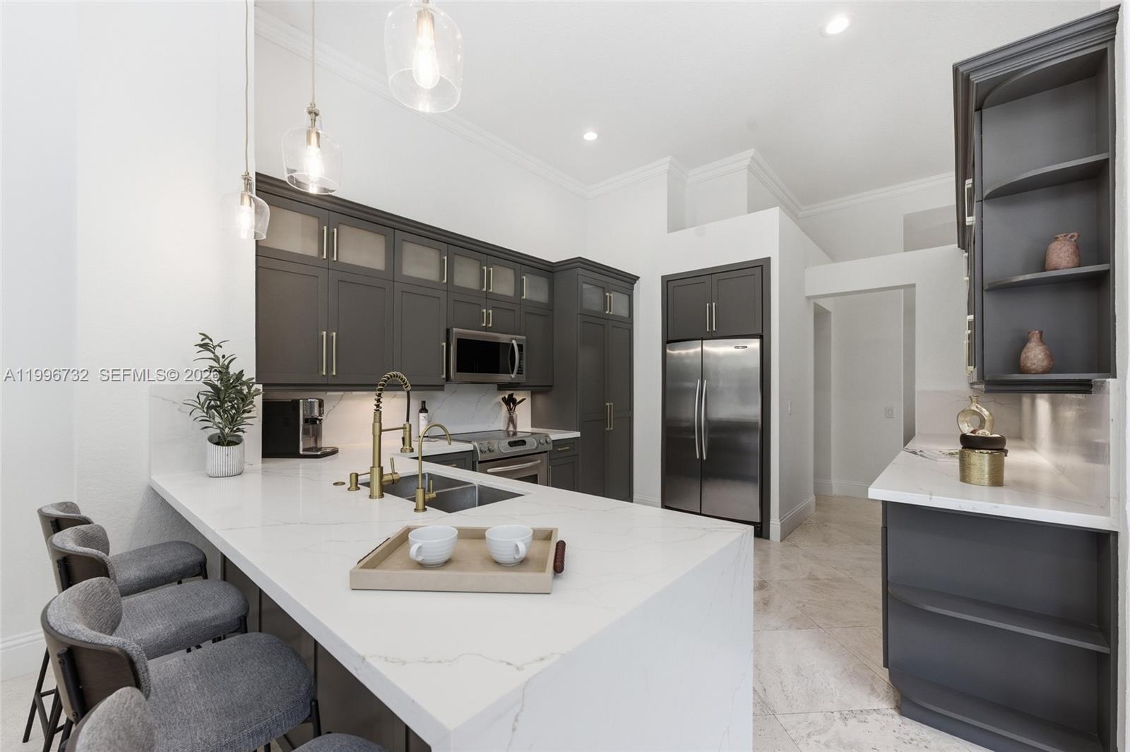 Tucked in the guard-gated community of Victoria Pointe in Weston Hills Country Club, this elegant triple-split one-story pool home is fully fenced and lushly landscaped. Features include a NEW ROOF 2020 and full Accordian Shutter protection. Modern shaker kitchen with new Quartz countertops, backsplash and Stainless Steel appliances. Diagonal Alabastrino Marble flooring in living areas, Wood floors in bedrooms, crown moldings, Plantation Shutters and Hunter Douglas shades. Glass front doors enhance natural light. Primary Bath fully updated in 2026 with new flooring, vanity, toilet, shower, and tub. Paver patio with Summer Kitchen. Walk to community park with basketball, playground and pickleball.