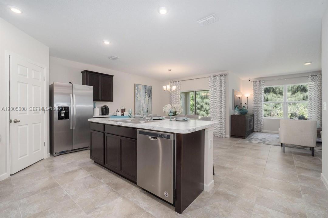 Beautiful home featuring 4 bedrooms, 2 bathrooms, and a 2-car garage converted into a 2nd Generation bedroom with 2 bedrooms, a kitchen, and a bathroom. The main house has a spacious kitchen that includes a large center island, walk-in pantry, 36" cabinets, and stainless appliances (range, microwave, dishwasher). Primary suite offers room for king-size furnishings, an oversized walk-in closet, and additional linen storage. Tile flooring throughout main living areas, with carpet in bedrooms. Enjoy a covered, trussed lanai and a fully landscaped yard with sod, shrubs, mulch, and 4 hardwood trees. Oversized homesite provides space for a future pool. Smart home package included. No HOA fees or restrictions.