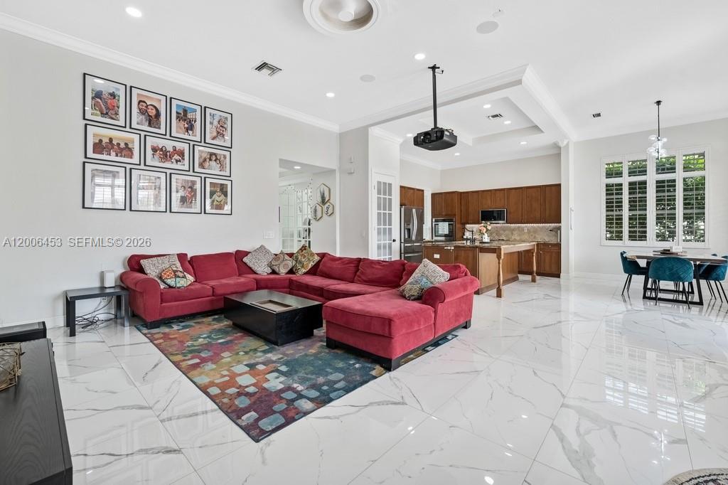 Completely updated lakefront home in The Glen at Heron Bay with over $350,000 in modern renovations. This single-story, 4-bed, 2.5 bath residence offers 2,554 square feet of thoughtfully redesigned living space on an 8,798 sq ft lot with private pool & scenic lake views. The desirable split-bedroom floor plan provides optimal privacy with bedrooms strategically separated throughout the home. Tile roof installed in 2019. Rare three-car garage exceptional for single-story homes with wide entry driveway. The comprehensive 2021 interior renovation includes Calacatta marble-inspired tile flooring throughout all main living areas, two fully remodeled bathrooms with contemporary finishes, upgraded pantry with enhanced storage, & a professionally converted office with new French doors offering privacy for remote work or quiet study. New primary closet doors complete the bedroom wing, while designer lighting updates include a linear chandelier over the dining area, statement sputnik fixture at the entry, & modern lighting throughout the home. Recent 2025 mechanical upgrades ensure move-in readiness: brand-new Samsung washer & dryer, new microwave, upgraded sprinkler system with commercial-grade pump, premium ceiling fans, serviced dishwasher with key components replaced, & garage door hardware updates. Community guard-gated security & resort-style amenities including two clubhouses, heated pools, jacuzzi, spa, saunas, tennis & many more. Top-rated Parkland schools.