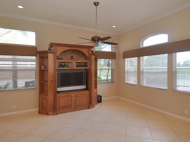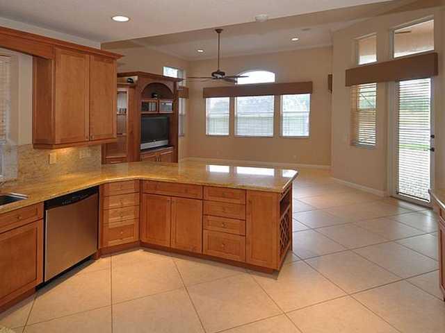 3BR/2.5BA pool home with incredible lake to golf views, situated at the end of cul-de-sac. Highly upgraded throughout. Kitchen offers 42" wood cabinets, granite counters, stainless steel appliance, under-cabinet lighting, pull-out drawers in pantry, lazy Susan and eat-in breakfast area. Upgraded Master Bathroom with wood cabinetry, granite counters and spa tub. Huge walk-in MBR closet. Screened and covered patio. Fully maintained community includes lawn and shrubbery maintenance.