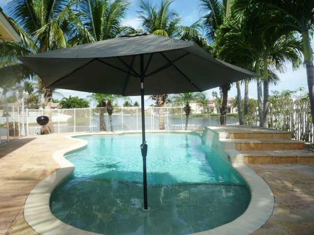 Superb 1 story, 4 bedroom, 2.5 bath waterfront, pool home on big pie-shaped, cul de sac lot in gated Palm Cove of Monarch Lakes. Upgraded throughout including gourmet kitchen with Staron solid surface counters, crown molding, closet built-ins, tile throug hout. Sliding glass doors and windows open to tropical paradisew/beautiful palms, gorgeous lake views, oversized patio perfect for entertaining, refreshing salt-water pool, covered patio w/extended awning & fenced yard. Walk to "A" rated elementary school