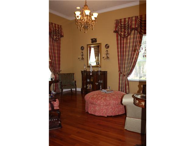 Amazing large home on an acre of property in a gated community. Accross from lake. Beautiful pool with waterfall and large patio area. Full 5 bedrooms plus an office. Gourmet kitchen with wood cabinetry and granite countertops. Butlers pantry with wine co oler. Stainless steel appliances.Gorgeous wood floors througout main areas. Huge master bedroom with luxurious master bath with jacuzzi tub and dual shower heads. His/Hers sinks and walkin closets. 14 foot ceilings and beautiful archways throughout.