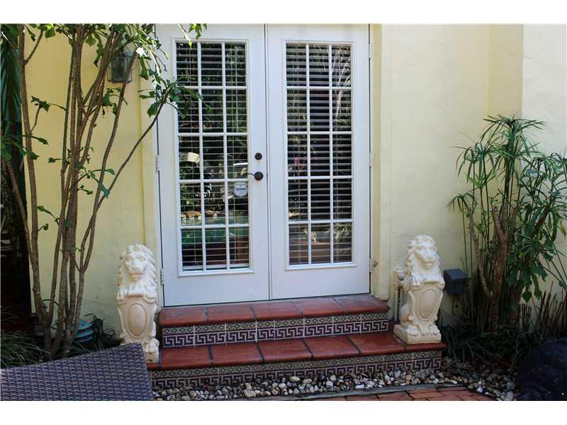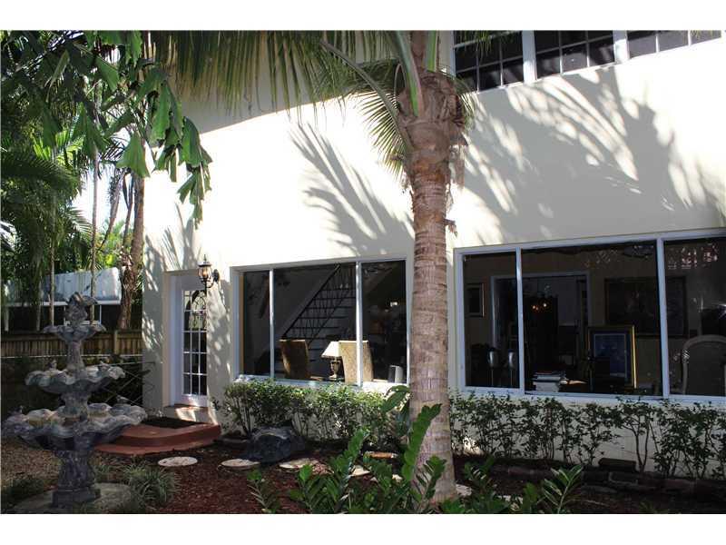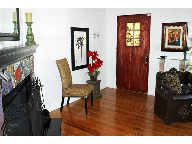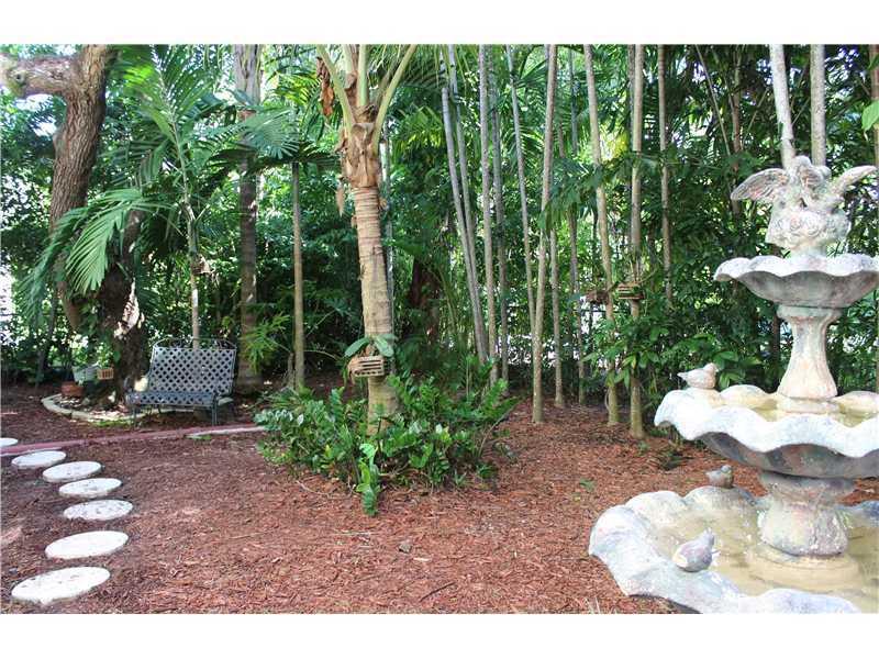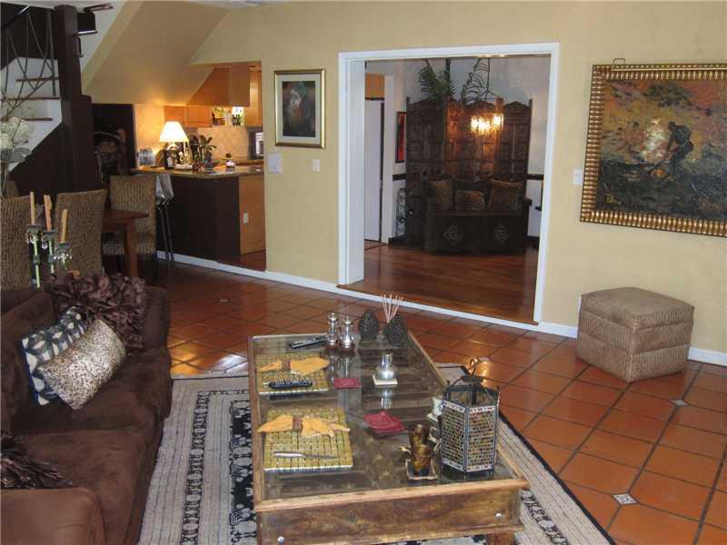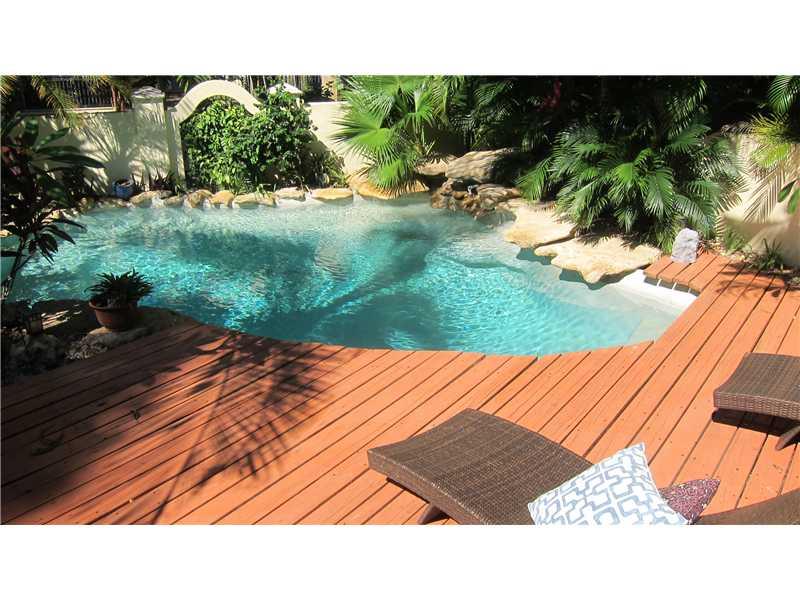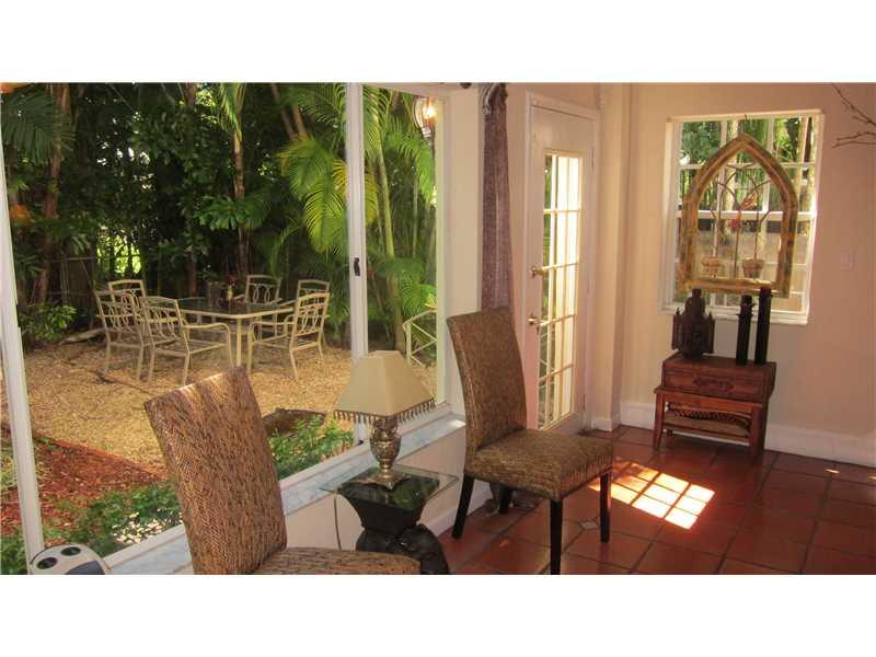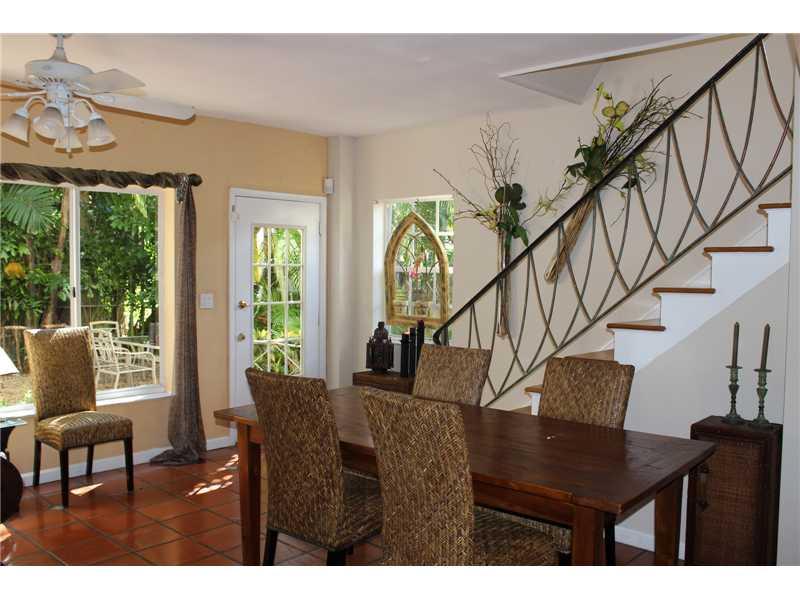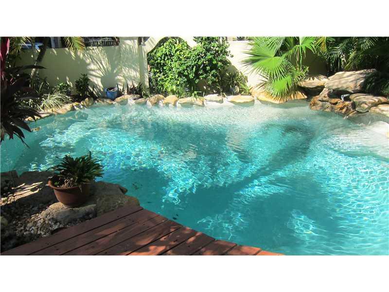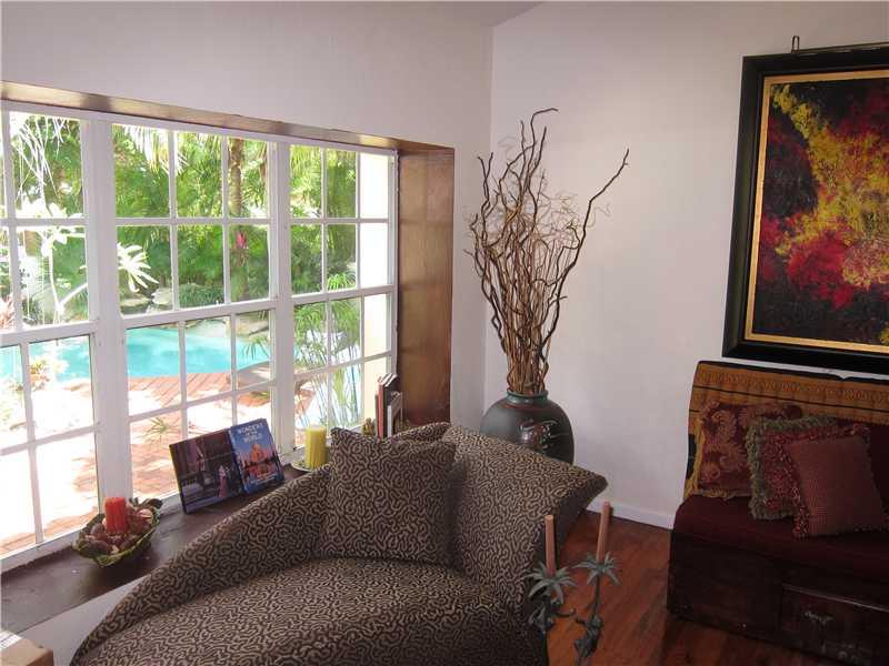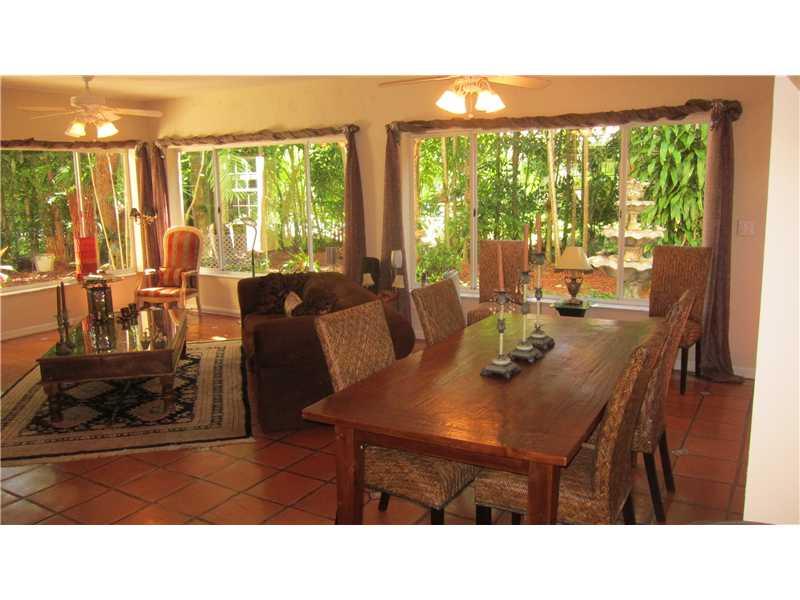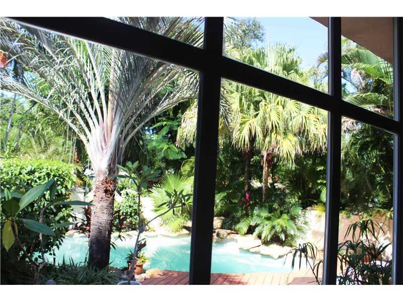 Great location for this tropical oasis just 2 blocks east of Gables/north of Hardie Rd. Gated courtyard with sparkling open pool & deck, perfect for entertaining. Enter LR w/high beamed ceiling and fireplace. Formal DR. Kit with breakfast bar. Den or 4th bedrm off kit next to laundry rm.Huge Fam rm across the back overlooks tree-shaded yard/stairs at one end to the master suite upstairs that has tree-top views, walk-in closet and updated bath. Two bdrms down/hall bath.