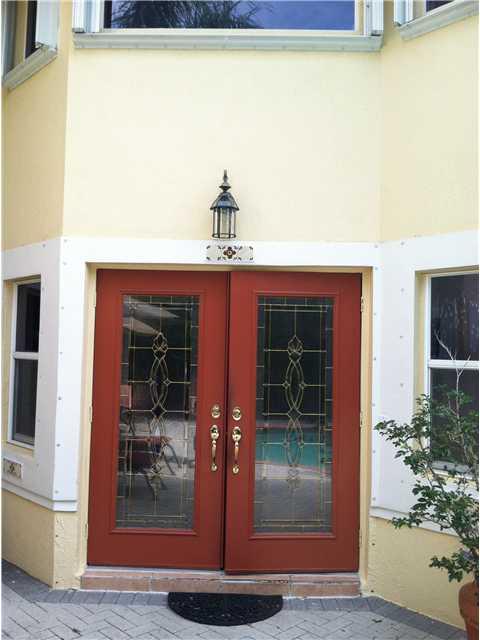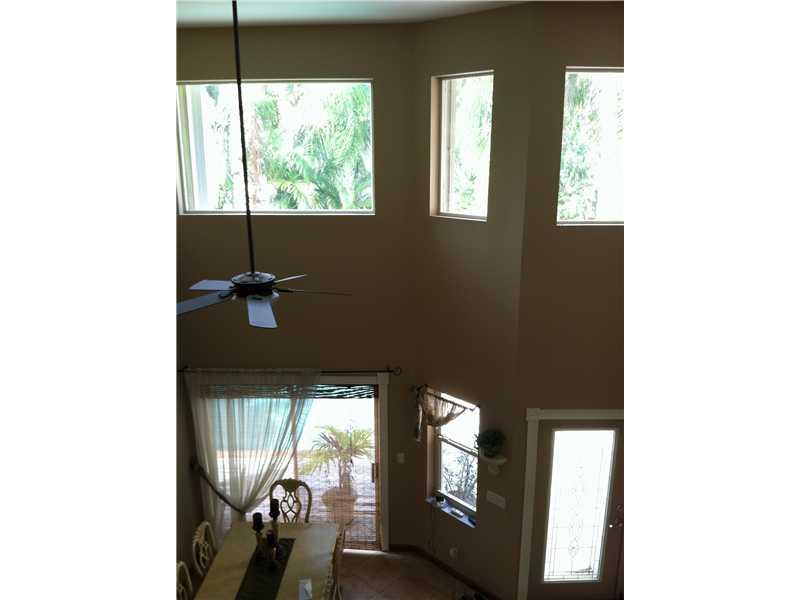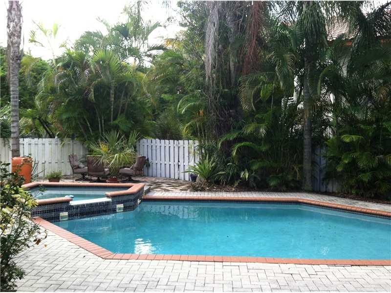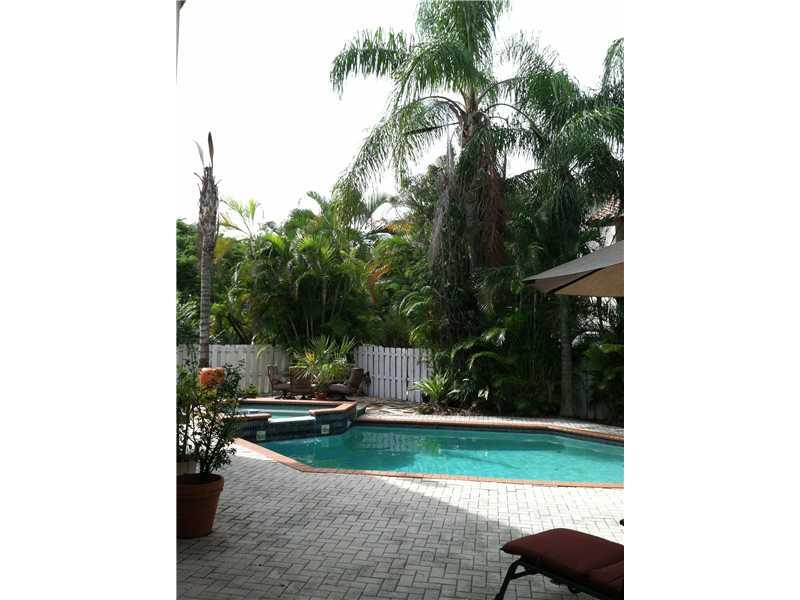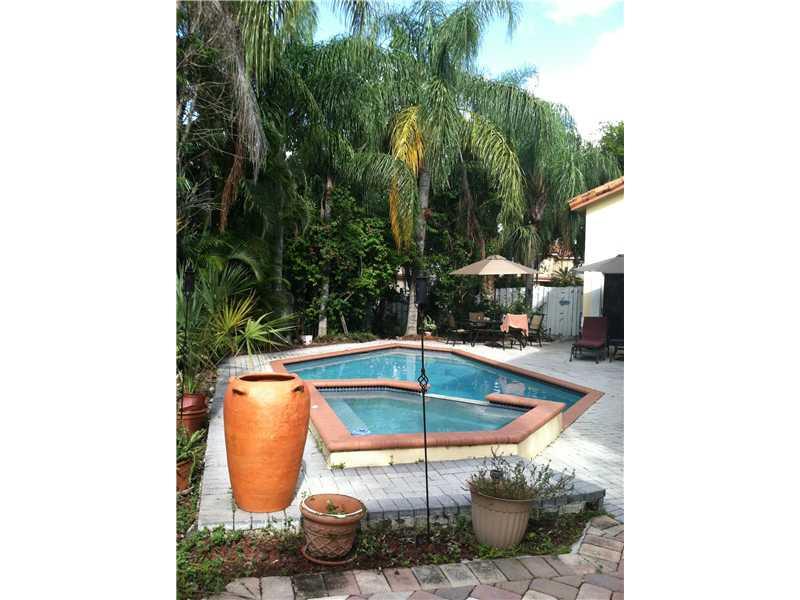 Upgraded 5bed 3.5ba courtyard home with pool & spa w/waterfall. Separate guest house inside large tropical fenced courtyard with brick pavers. 18x18 stone tiles w/inlays, beveled stained glass entry doors, remodeled kitchen w/stunning wood cabinets, crown molding, corian like countertops, full tile backsplash, stainless steel appliances. CBS construction & concrete 2nd floor, split bedroom plan. Oversized interior corner lot in gated community.