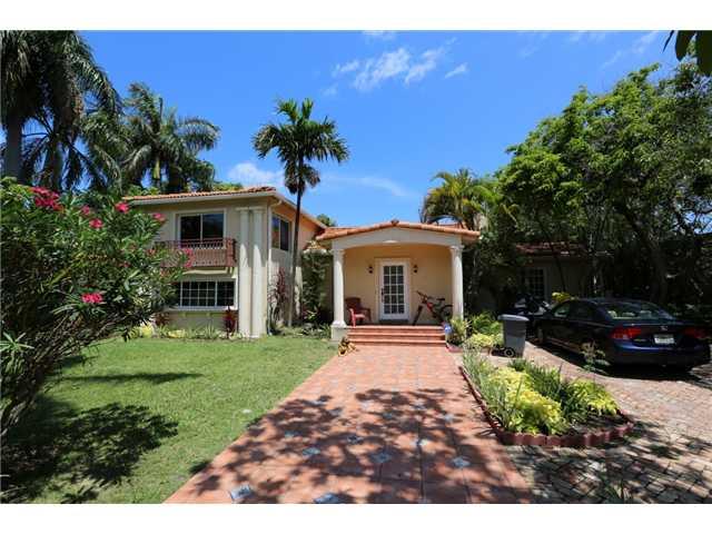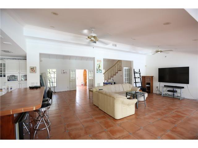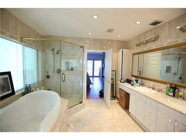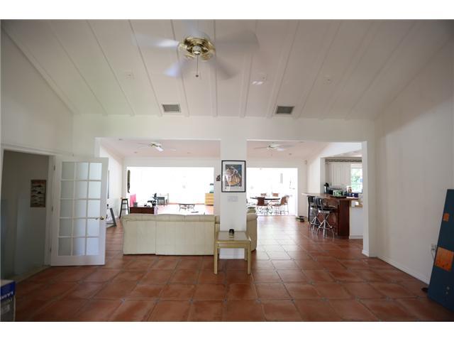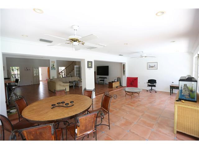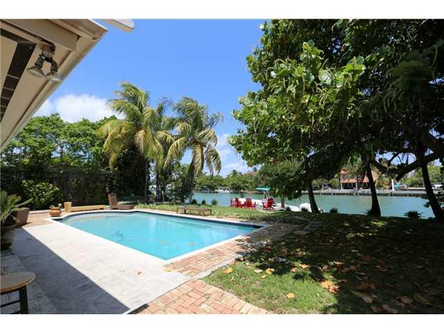 Across remodeled golf course, 80 feet waterfront, large upstairs master with wood beamed ceiling and open balcony overlooking solar heated pool, waterway, and dock. Walk to houses of worship, near schools and beach. Currently rented, easy to show.