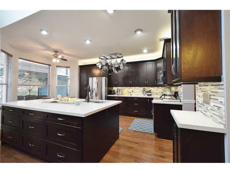 THIS GORGEOUS WATERFRONT 4/3 SINGLE FAMILY HOME IN A PRESTIGE COMMUNITY W/AN AMAZING CLUBHOUSE FEATURES NEW GOURMET KITCHEN W/HUGE ISLAND, DOUBLE CONVENTIONAL OVEN, & STIANLESS STEEL APPLIANCES. REMODELED MASTER BEDROOM & BATHROOM W/NATURAL STONE. GUEST B EDROOM ON 1ST FLOOR AND REMODELED DOWNSTAIRS BATHROOM. BUILT IN BAR W/WOODEN CEILING IN FRONT ROOM & WINE CELLAR. 2'' WOODEN BLINDS THROUGHOUT THE HOME & SECURITY ALARM. 600 SQ.FT. SCREENED PATIO W/TILE & TEAK FLOORING, CUSTOM OUTDOOR KITCHEN W/BBQ.