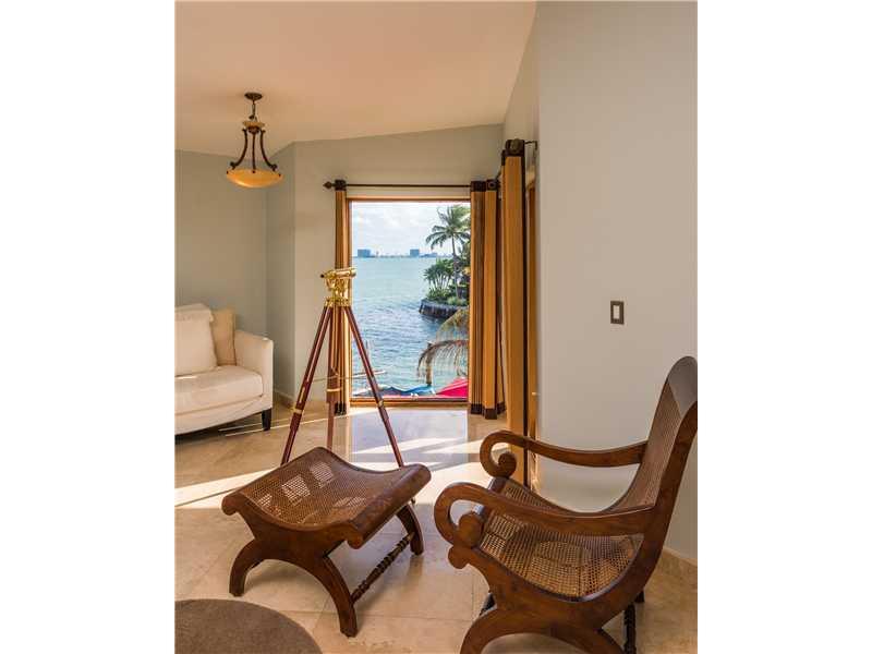 Smashing bay views w/ protected deep water for your boat from this 4 bedroom, 5.5 bath Florida Contemporary waterfront home in luxurious guard-gated neighborhood. One lot off Biscayne Bay w/views throughout, open airy interior w/soaring ceilings, marble t hroughout, open state-of-the-art gourmet kitchen, all updated baths w/top-of-the-line fixtures & fittings, luxurious master suite w/balcony overlooking the bay. Negative edge pool, cabana bath, tiki hut, dock, boatlift, fish station. 10 mins to the ocean.