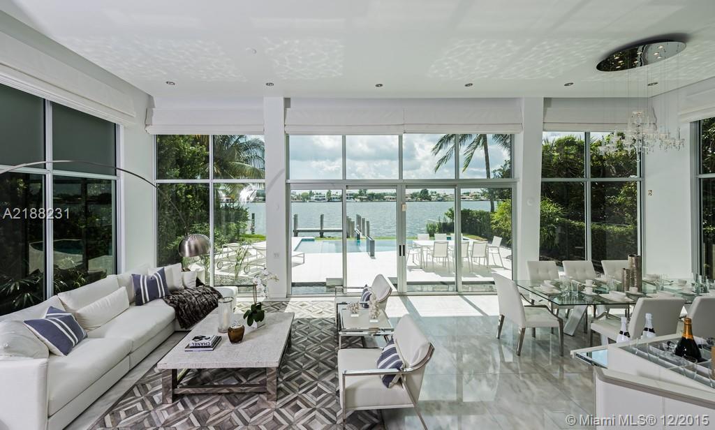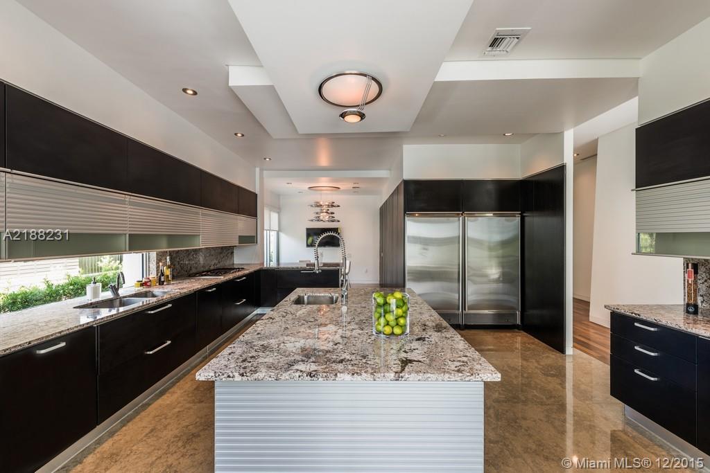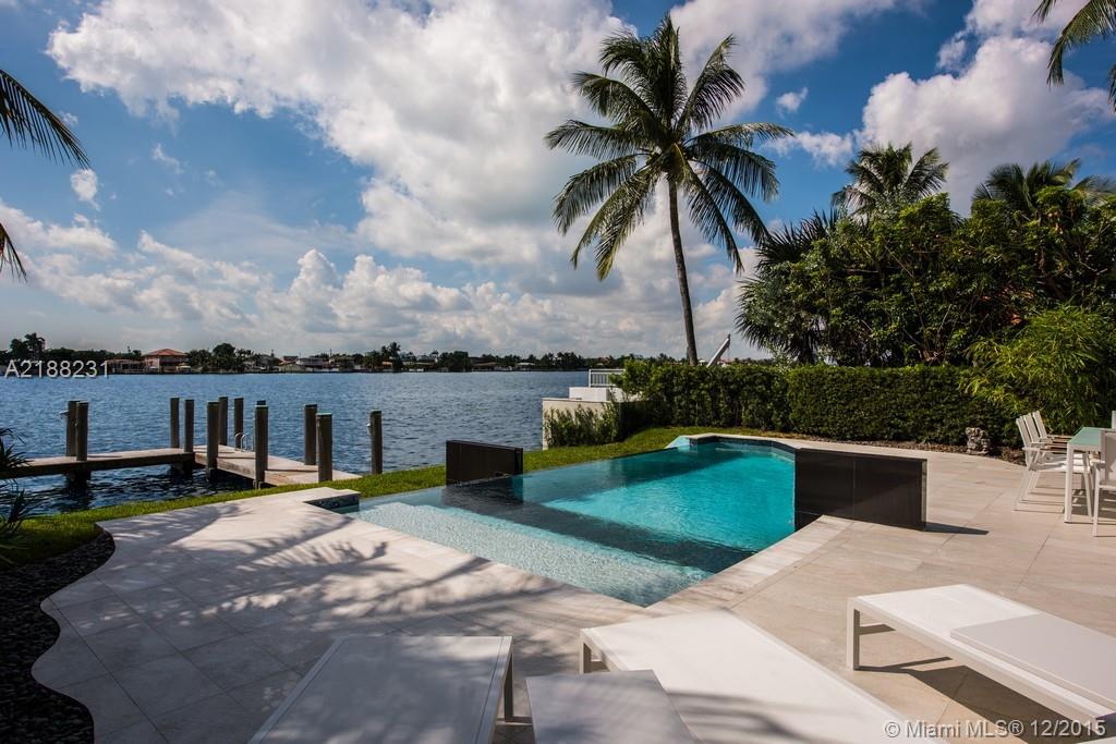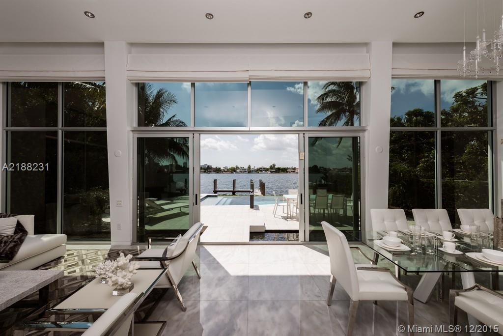 Serene Isle of Biscaya. Contemporary smart waterfront home, offers light filled living spaces surrounded by soaring glass walls & fountains, hovering over the wide bay, creating a sensory filled living environment. State of the art finishes and a great fl oor plan including, 5 bedrooms 5 baths upstairs, with a 1,200 s/f master suite. Dock, pool, 2 car garage plus room for lifts, 2 bedroom suites downstairs, eat in kitchen, family room, office, formal living and dining and more.