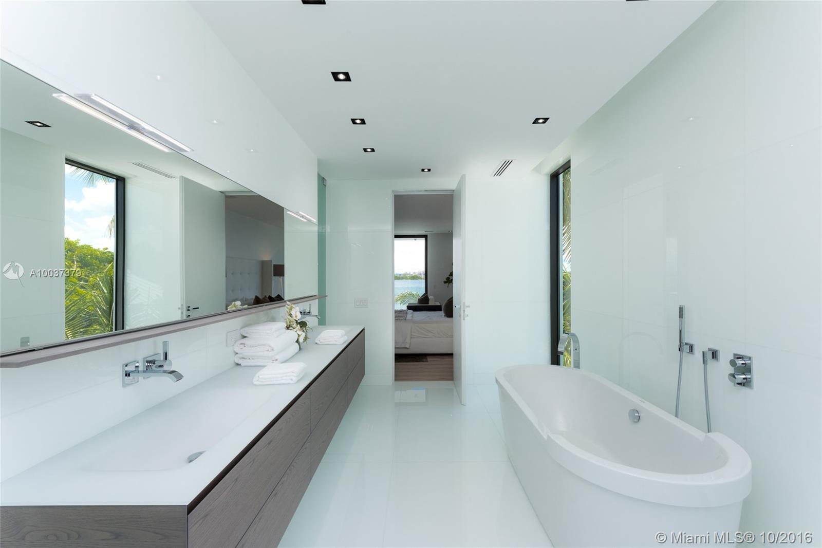 New modern masterpiece w/70ft of waterfront & breathtaking Miami skyline & open bay views. Designed by architect Jose Sanchez & built w/utmost attention to every detail using highest quality materials & finishes: glass enclosed large living rm, Poliform kitchen & closets, Sub-Zero/Wolf appliances, Calacatta marble & wood floors, frameless Italian doors. Large master suite w/direct Miami skyline views. Exterior: dock, rooftop terrace, deck w/ pool, spa & summer kitchen & 2car garage.