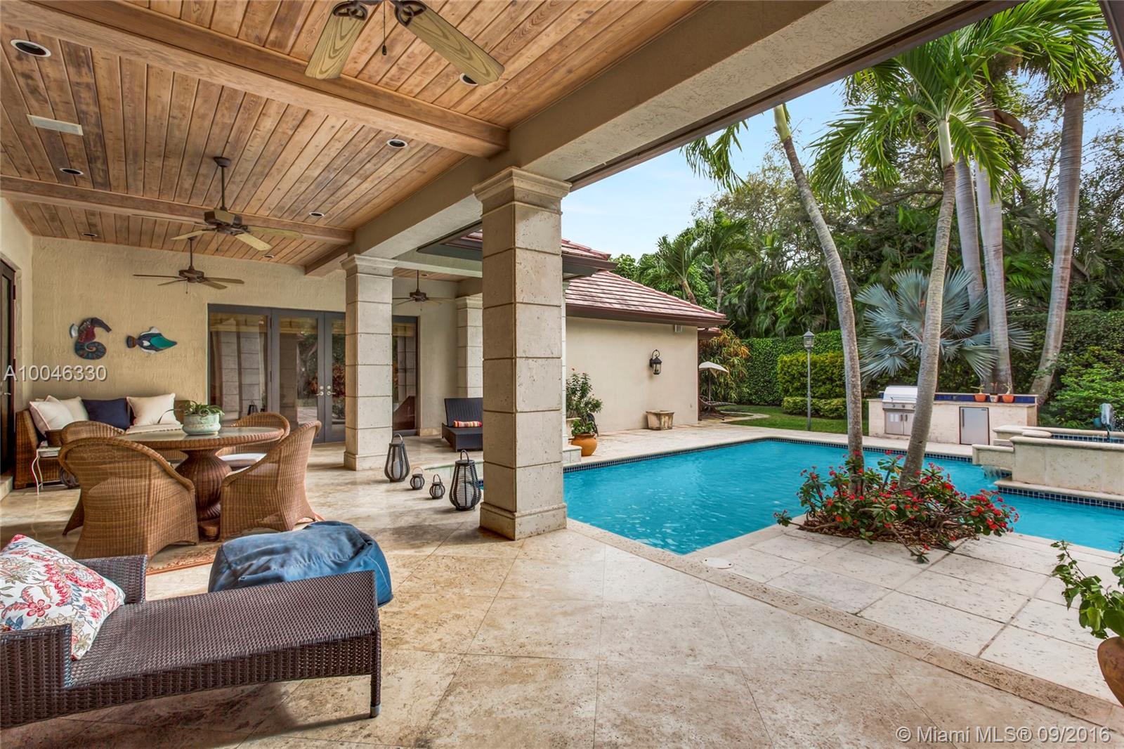 Elegant one story completely remodeled in 2002. Foyer entry w/views to outdoors. Frml lv/rm & dn rm.Kitchen features breakfast bar w/granite countertops & top of the line s/s appl. Fmly rm has vaulted ceiling & fireplace w/Travertine marble flr.Large master suite w/sitting area, 2 large his/hers walk-in closets. Mster bath has custom wood cabinetry and frameless glass shower enclosure. 2bd 2/jack and jill bath, walk-in closets a 4th bd use as library/den.The lush yard is very private great/pool/patio.