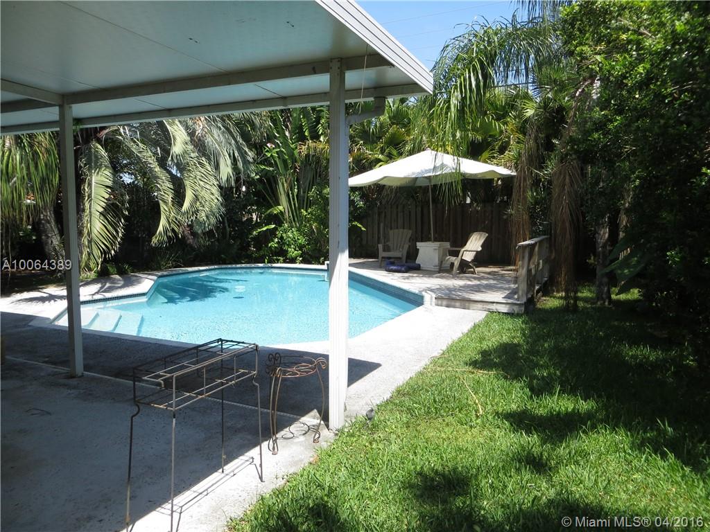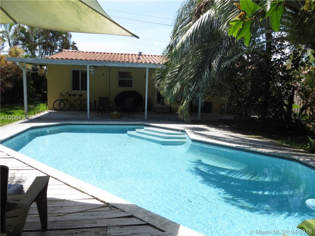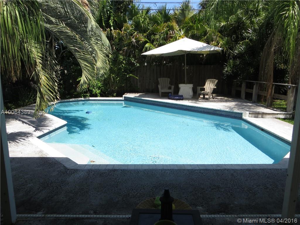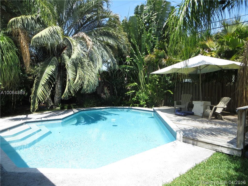 Gorgeous well kept home in sought after Poinsettia Heights. Tile floors through out. Updated bathroom and kitchen. Lots of windows and light in this charming 2 bedroom / 1 bath home. Lush tropical landscaping around beautiful pool. Large open porch for outdoor living in tropical paradise. Fenced in yard is very private. Gas water heater and dryer, separate utility room for storage and laundry. Easy walk to US1 restaurants and shopping. Home is also listed for rent, annual lease, $2,400 per month