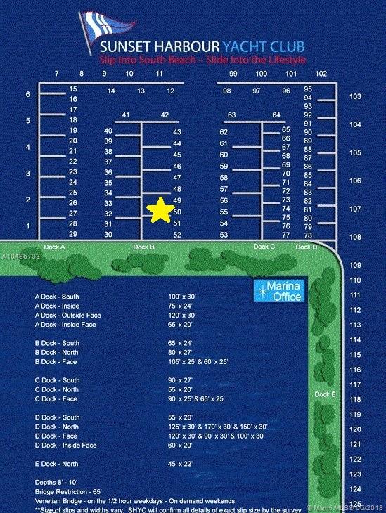 Boat Slip B-50 (Dock B) a 80 foot slip by 27 foot wide. Voted Miami Beach’s best marina! It's the only private yacht club with slips ranging from 45’ to 150’. Membership includes an Olympic-size heated pool, fitness center, BBQ area, pump-outs, water, garbage removal. Located in the heart of Miami Beach walking distance to fine restaurants, shopping, movies, Lincoln Road, the beach and more.