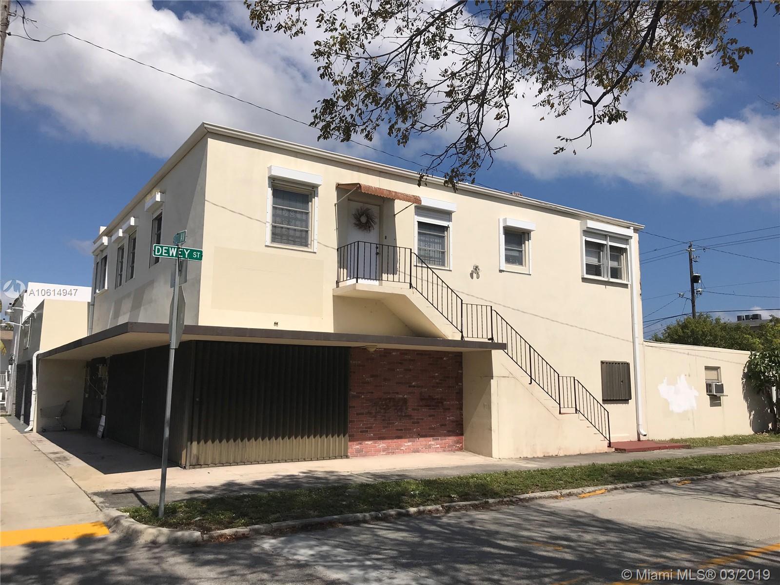 Great Investment opportunity or a chance to live above your business! Large two story corner mixed use building, great location, just blocks from downtown Hollywood. 3/2 apartment with two living rooms on the second floor (1800 SQFT- upgraded with tenant in place ($2,000pm rent). First floor (2500 SQFT) is vacant and can be used for a variety of office, retail and medical uses. There are currently 7 offices, a receptionist/waiting area and there is a large workplace/storage area in the back. Two bathrooms downstairs and room for 7 cars in the back of the property (3 in the garages and 4 outside). Fenced in property with ample room to expand if needed. Downstairs has shutters in the front of the building for hurricane and protection. Laminate/tile floors and lots of closet space.
