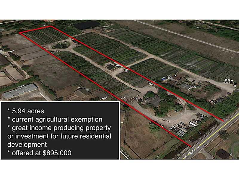 EXCELLENT OPPORTUNITY IN DAVIE, FL TO PURCHASE FOR FUTURE RESIDENTIAL OR INVESTMENT. LISTED BELOW BCPA VALUE OF $933K. 5.94 ACRE PROPERTY CURRENTLY OPERATES AS NURSERY WITH MONTH -TO-MONTH TENANT. OF THE 5.94 ACRE PROPERTY, 4.32 ENJOYS THE AG DESIGNATION. A POND ON PROPERTY ALLOWS FOR NECESSARY WATERING OF ALL TREES & PLANTSWITHOUT INCURRING WATER BILL. THERE IS A HOME ON PROPERTY (UTILIZED AS AN OFFICE) AND A UTILITY WORKSHOP FOR MACHINERY & VEHICLES. CENTRALLY LOCATED BEWTEEN GRIFFIN & STIRLING.