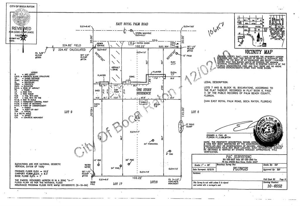 Location, Location, Location. Backs up to Boca Raton Golf Club. Unbelievable location! Walk to the Mizner Park Shops, Restaurants and the Beach! Build your dream home here! Close to the Boca Raton Resort. Beautiful Golf Course views! One of the last few pieces of land available in East Boca Raton.There is no longer a structure on this property. There are 2 pine trees, 1 oak tree and 1 cabbage palm tree all on the outside perimeter of the property. Survey attached as photo or in documents.